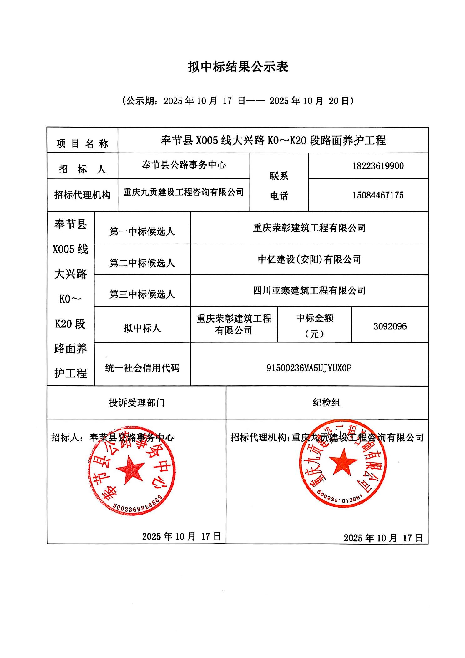 奉节县X005线大兴路K0~K20段路面养护工程拟中标结果公示