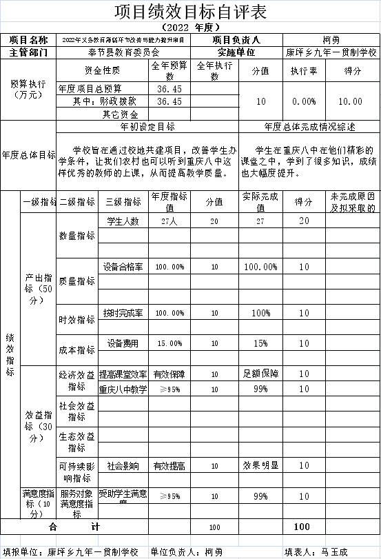 (一)县财政下达项目绩效目标情况。奉节县财政局《关于下达2022年薄弱学校改善与能力提升项目资金的通知》(奉节财行〔2022〕136号文件安排资金13.5万元和179号文件安排资金22.95万元,资金合计36.45万元),在下达资金预算时同步下达了绩效目标。一个项目有两个类别:一个是购置费,一个是电子白板费,所以有两个文件,我们根据总的绩效目标开展自评。
