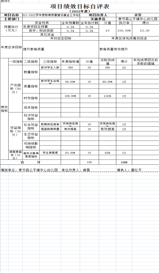 按奉节县财政局《关于开展2022年度预算绩效目标评价工作的通知》(奉节财绩〔2022〕2号)的要求,开展自评。按奉节财预【2022】98号,下达资金0.34万元。