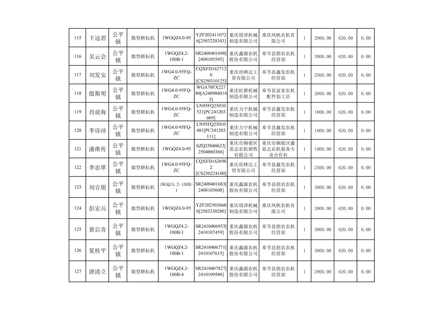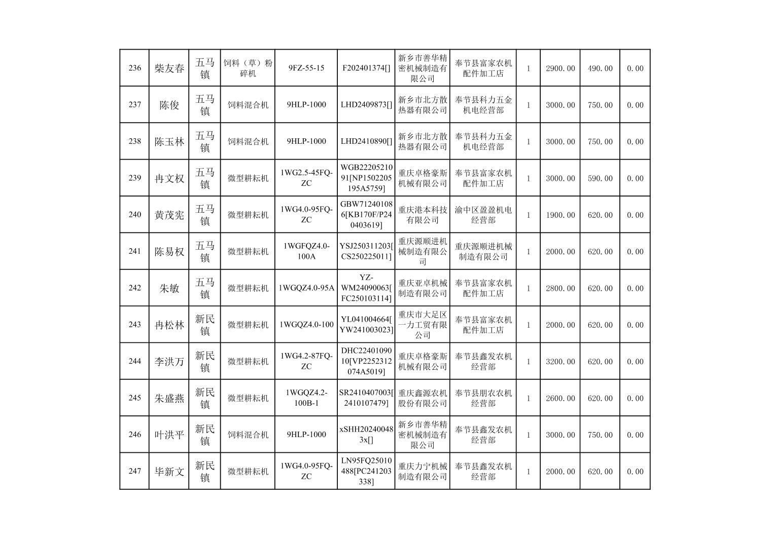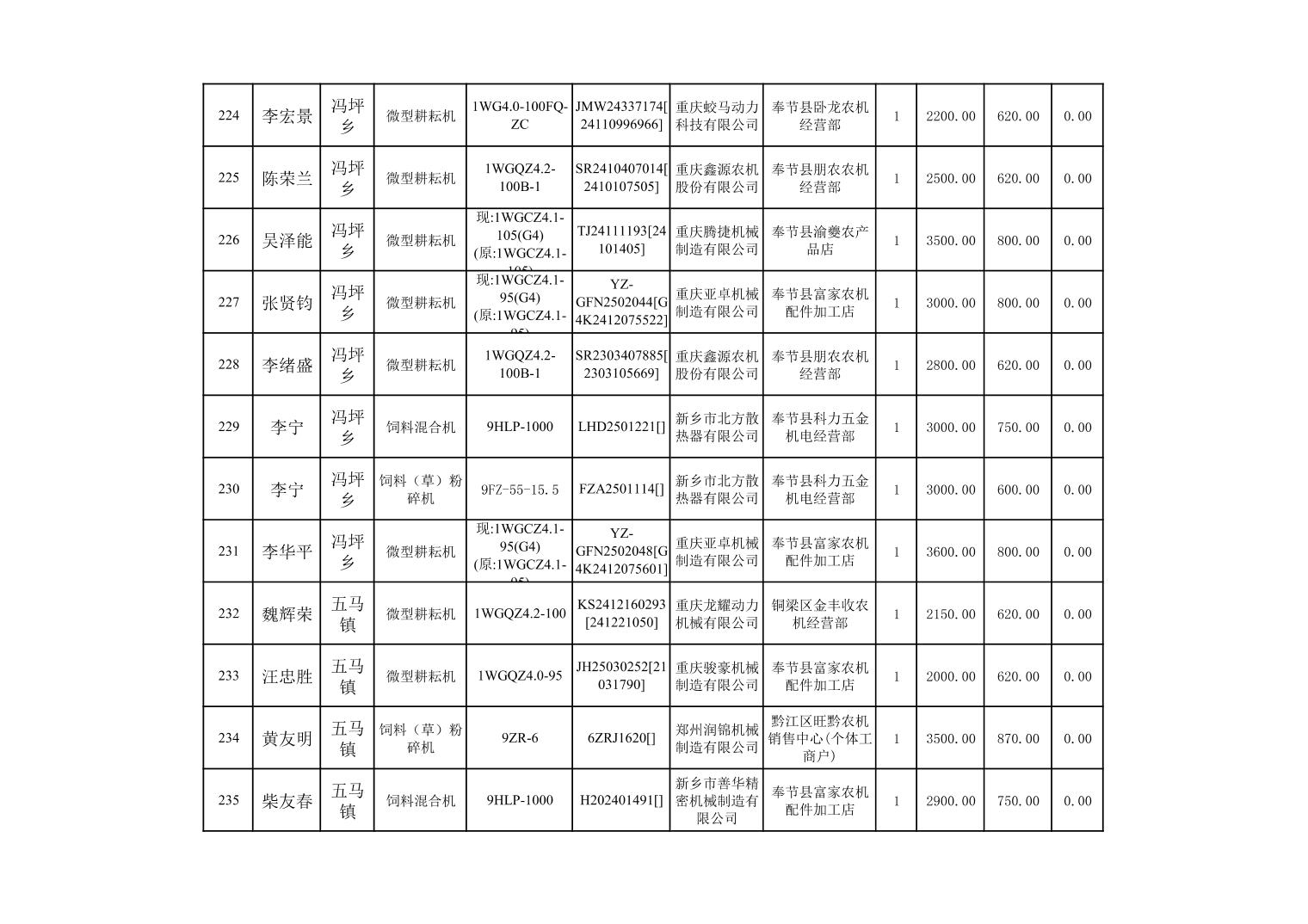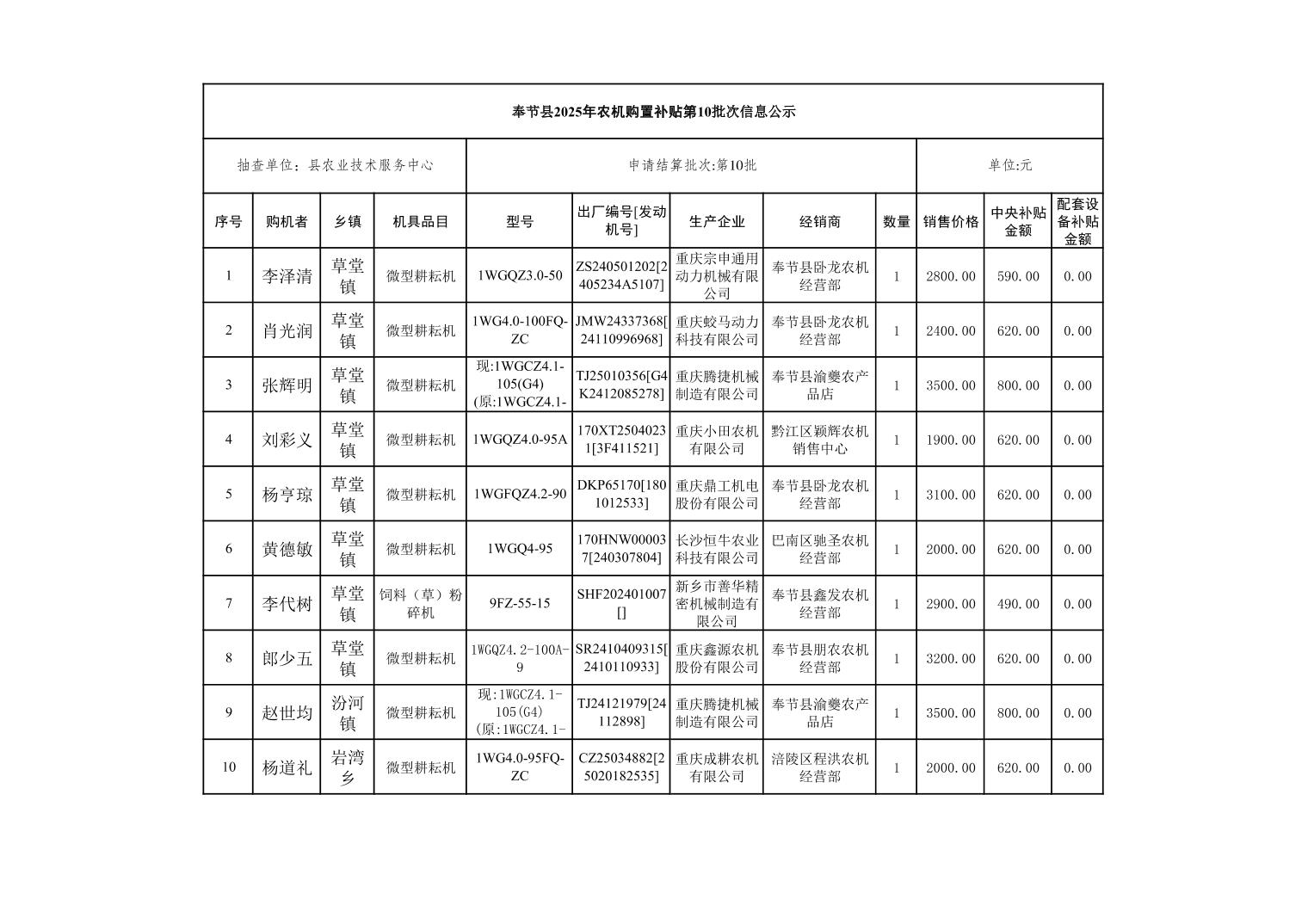 奉节县2025年农机购置补贴第10批次信息公示