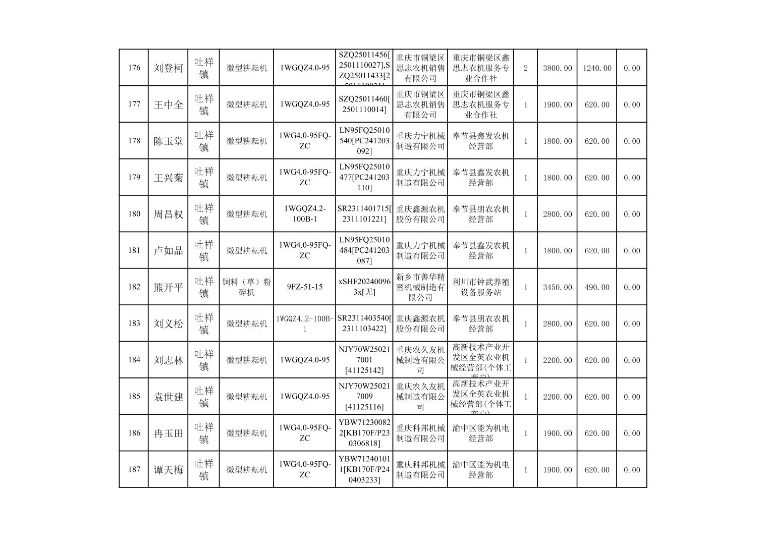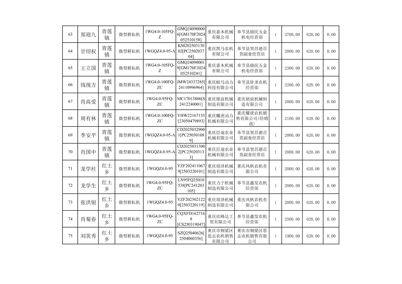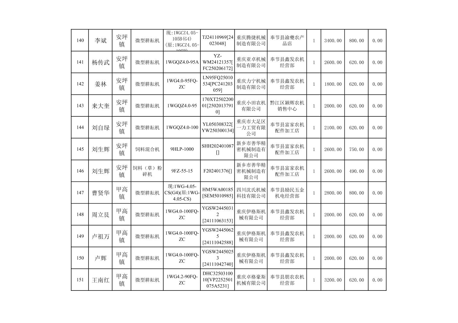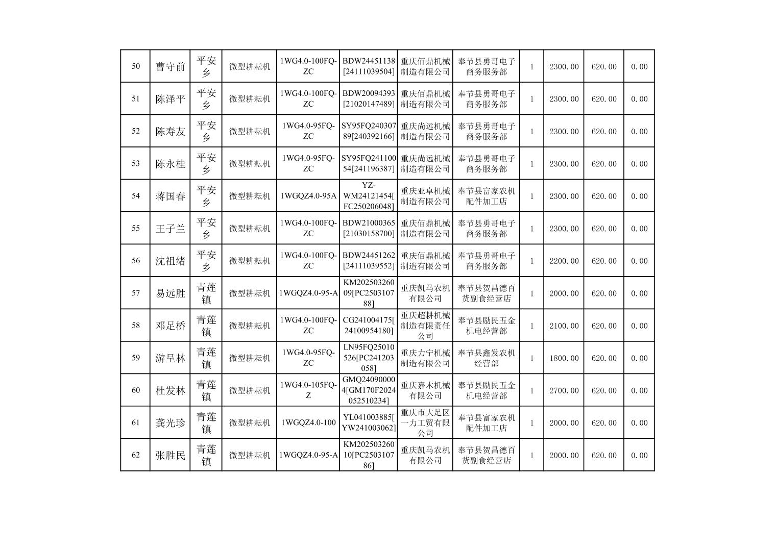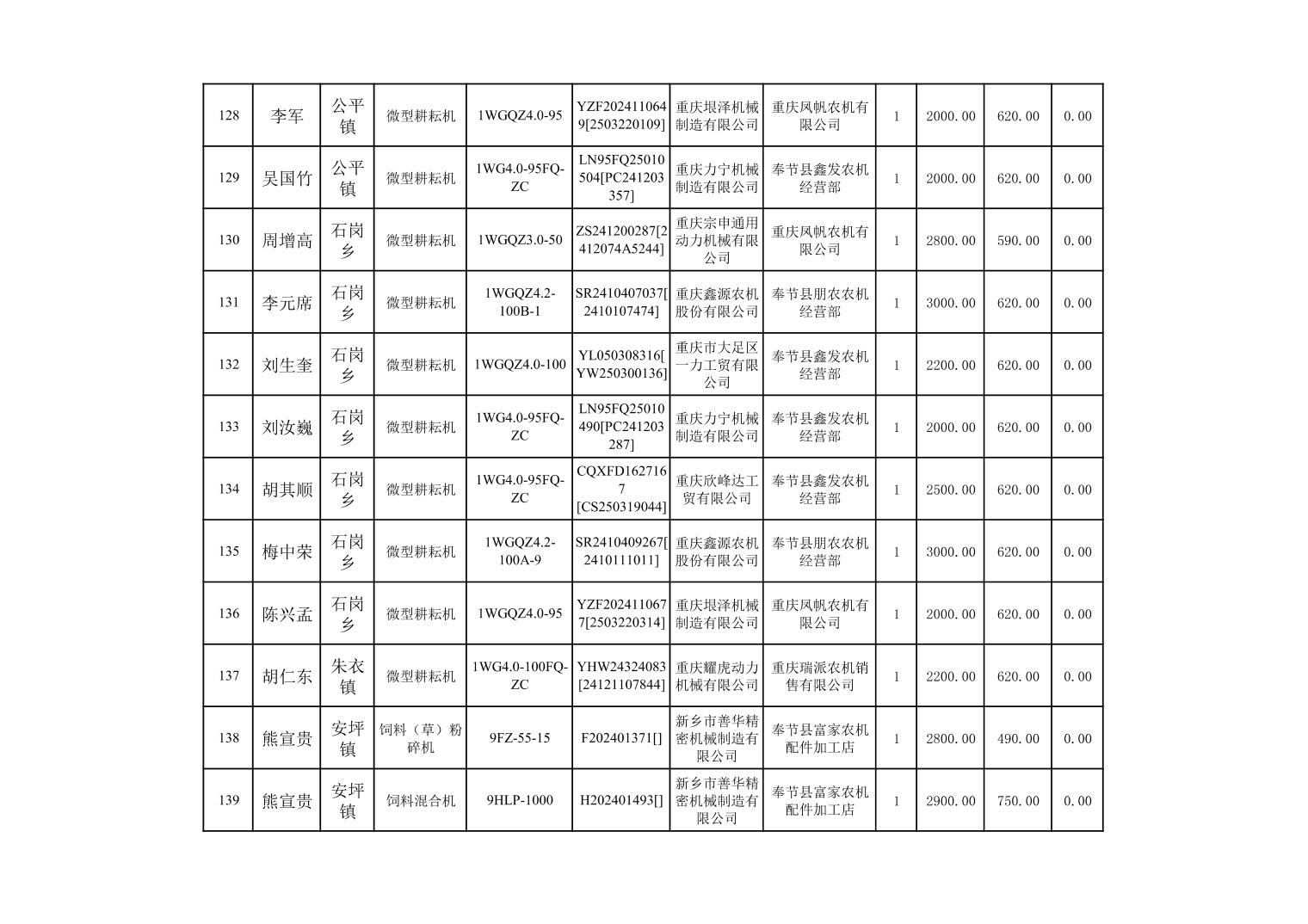 奉节县2025年农机购置补贴第10批次信息公示