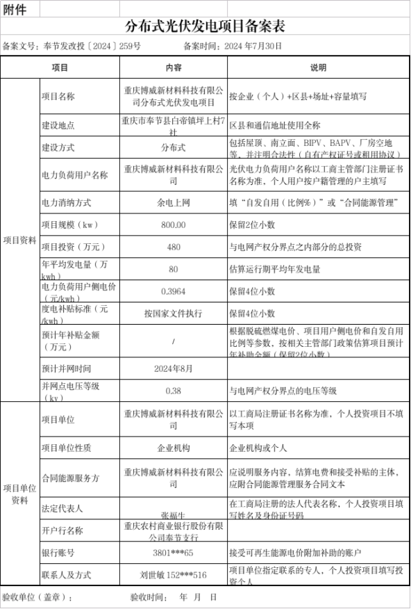 你单位报来的《关于重庆博威新材料科技有限公司分布式光伏发电项目备案的请示》及相关资料收悉。根据国家能源局《分布式光伏发电项目暂行管理办法》和重庆市发展和改革委员会《关于转发分布式光伏发电项目管理暂行办法的通知》(渝发改能〔2014〕523号)精神,经研究,同意对该项目备案(项目代码:2407-500236-04-02-178023)。装机容量800KW;总投资480.00万元。本批复文件有效期2年。