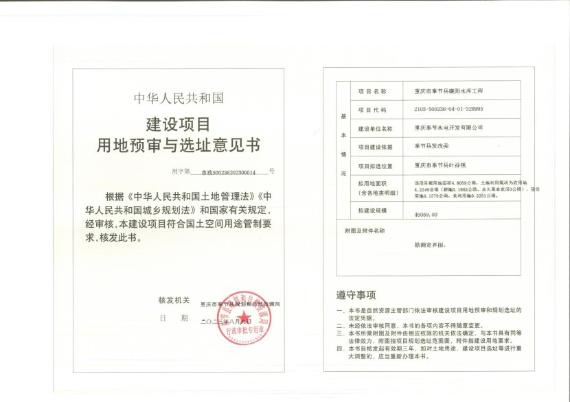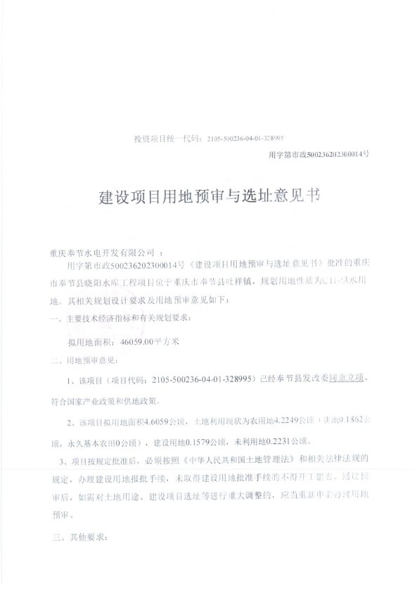 一、项目名称:重庆市奉节县晓阳水库工程(项目代码:2105-500236-04-01-328995)。