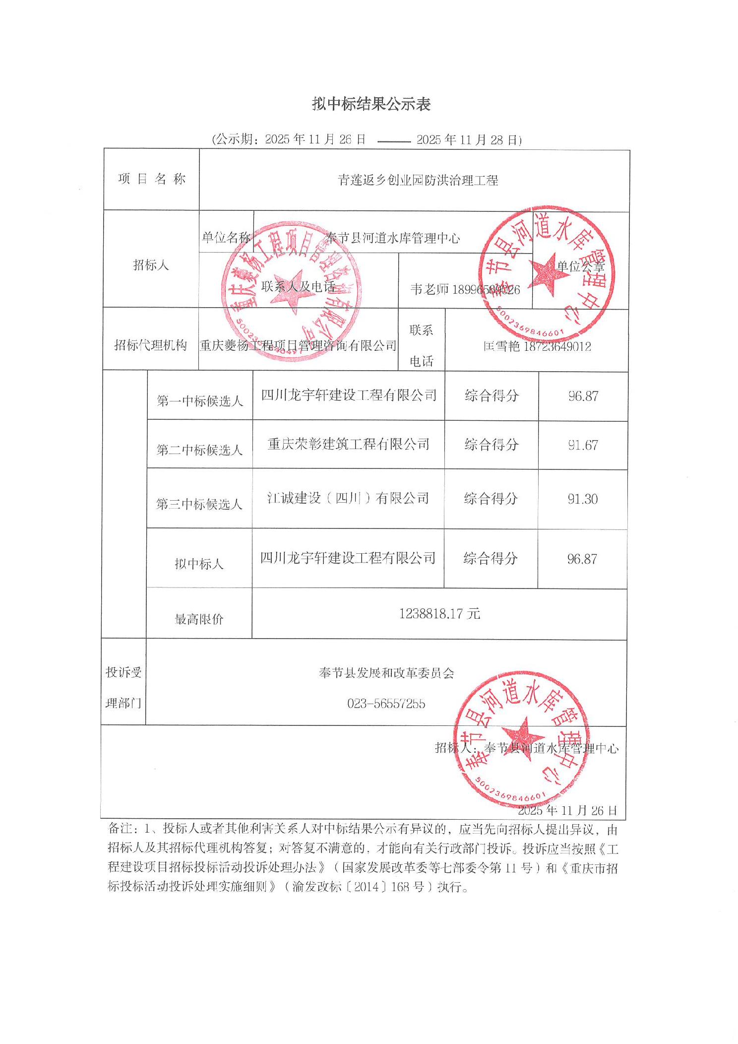 青莲返乡创业园防洪治理工程竞争性比选拟中标公示