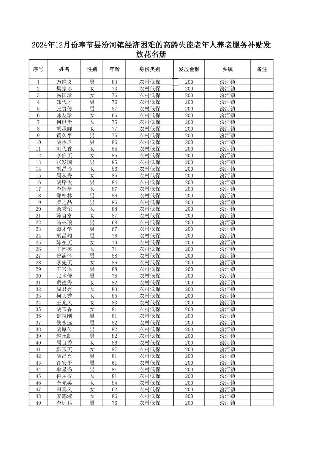 2024年12月份奉节县汾河镇经济困难的高龄失能老年人养老服务补贴发放花名册