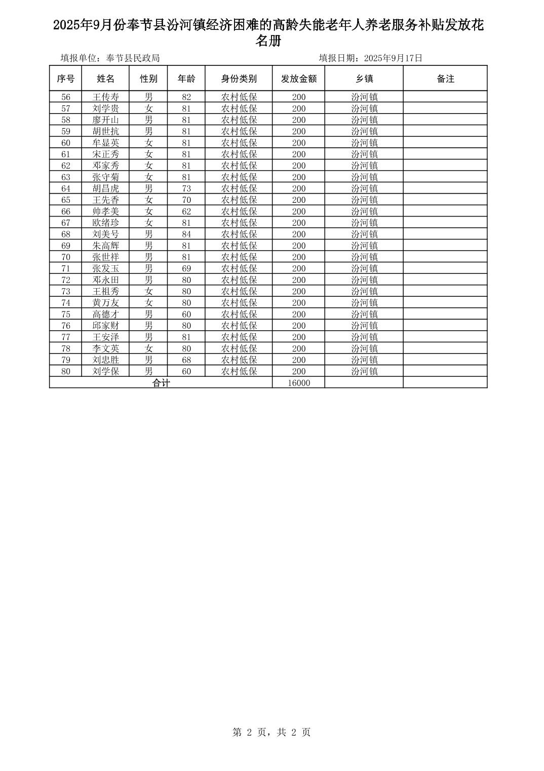 2025年9月份奉节县汾河镇经济困难的高龄失能老人养老服务补贴花名册