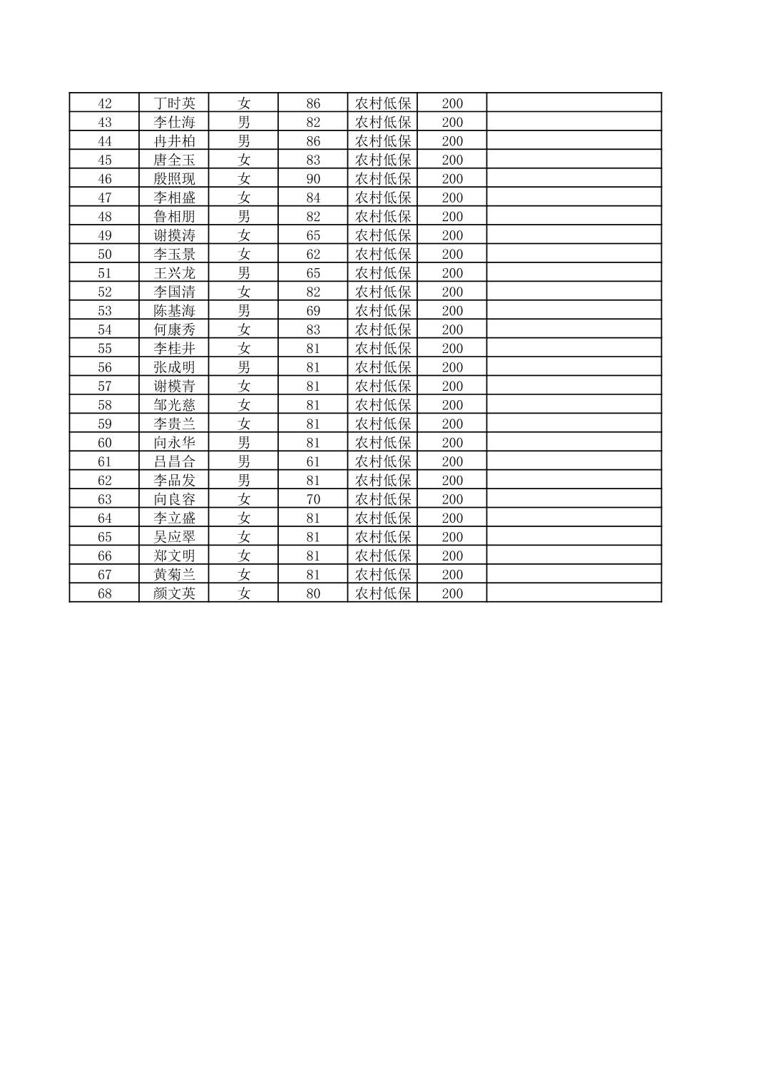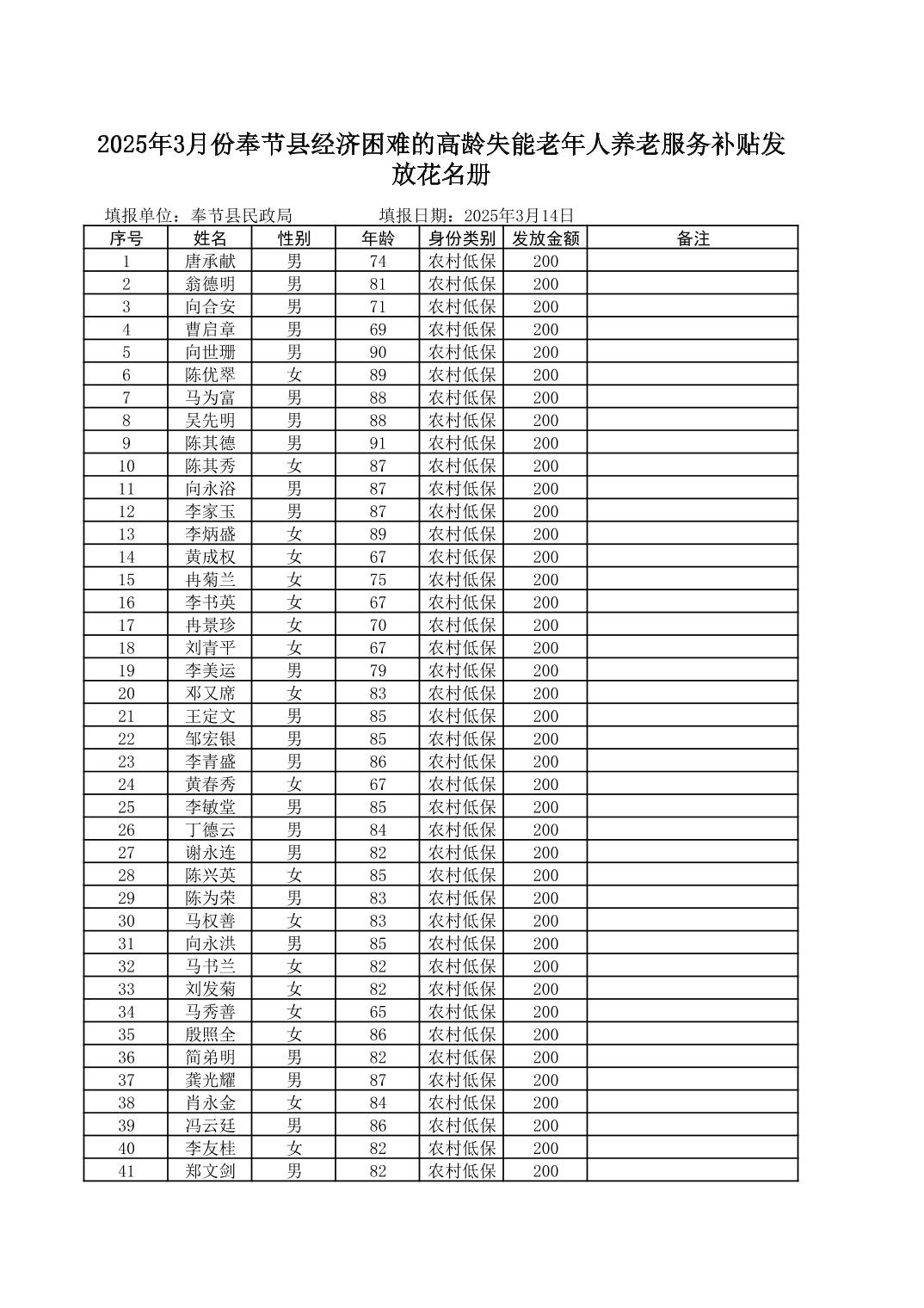 2025年3月份奉节县冯坪乡经济困难的高龄失能老年人养老服务补贴发放花名册
