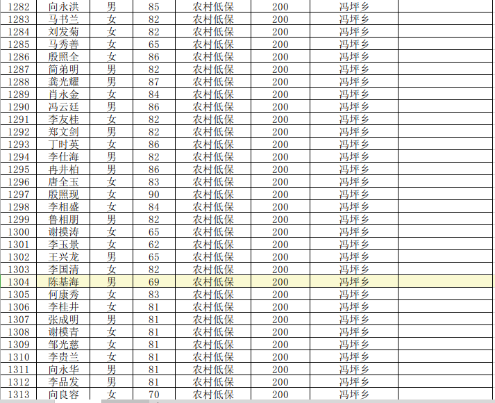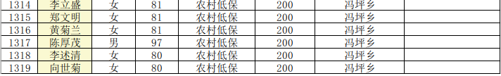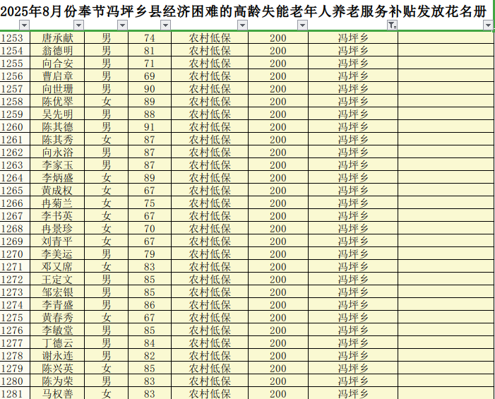 2025年8月份奉节冯坪乡县经济困难的高龄失能老年人养老服务补贴发放花名册