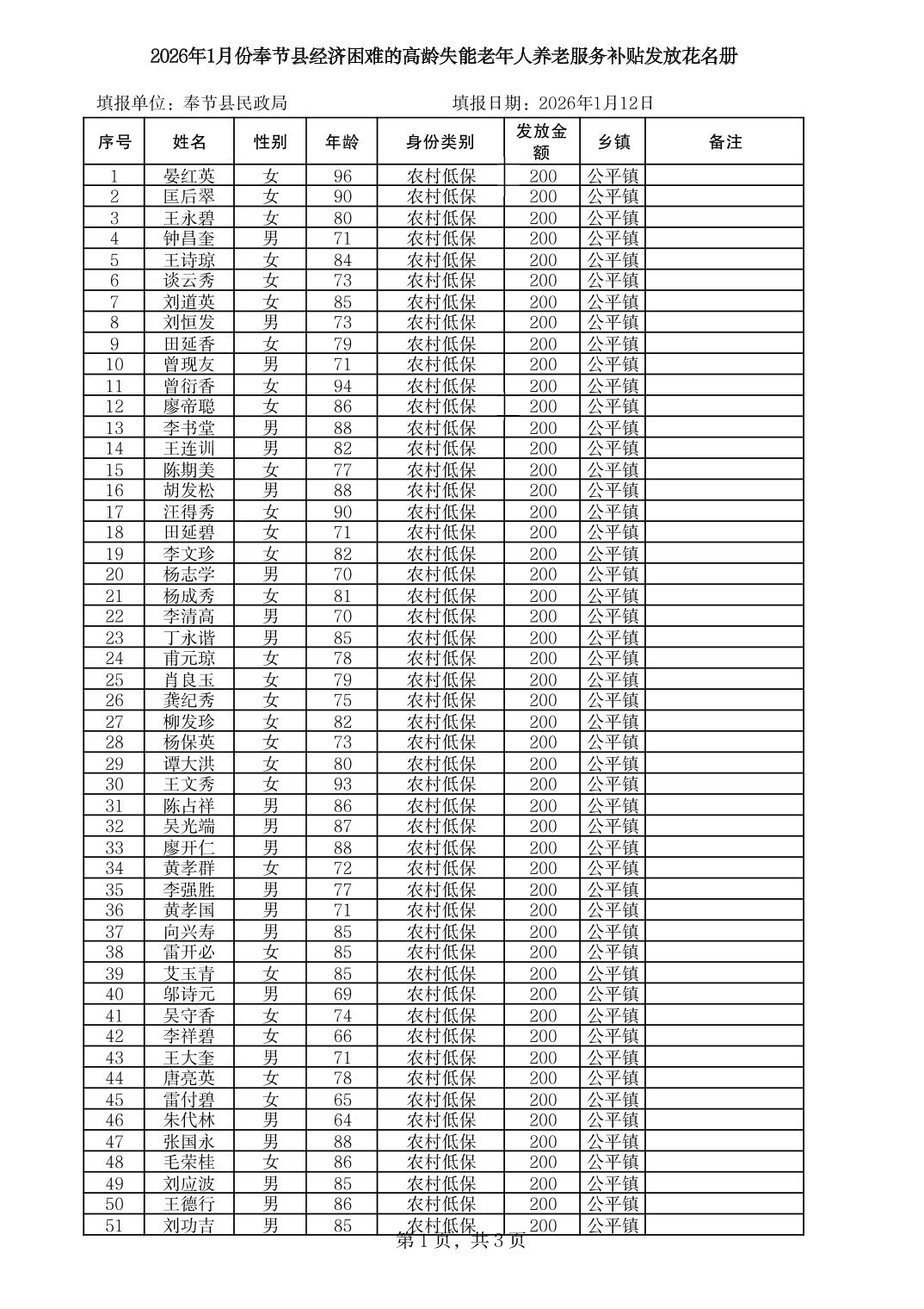 2026年1月份奉节县公平镇经济困难的高龄失能老年人养老服务补贴发放花名册