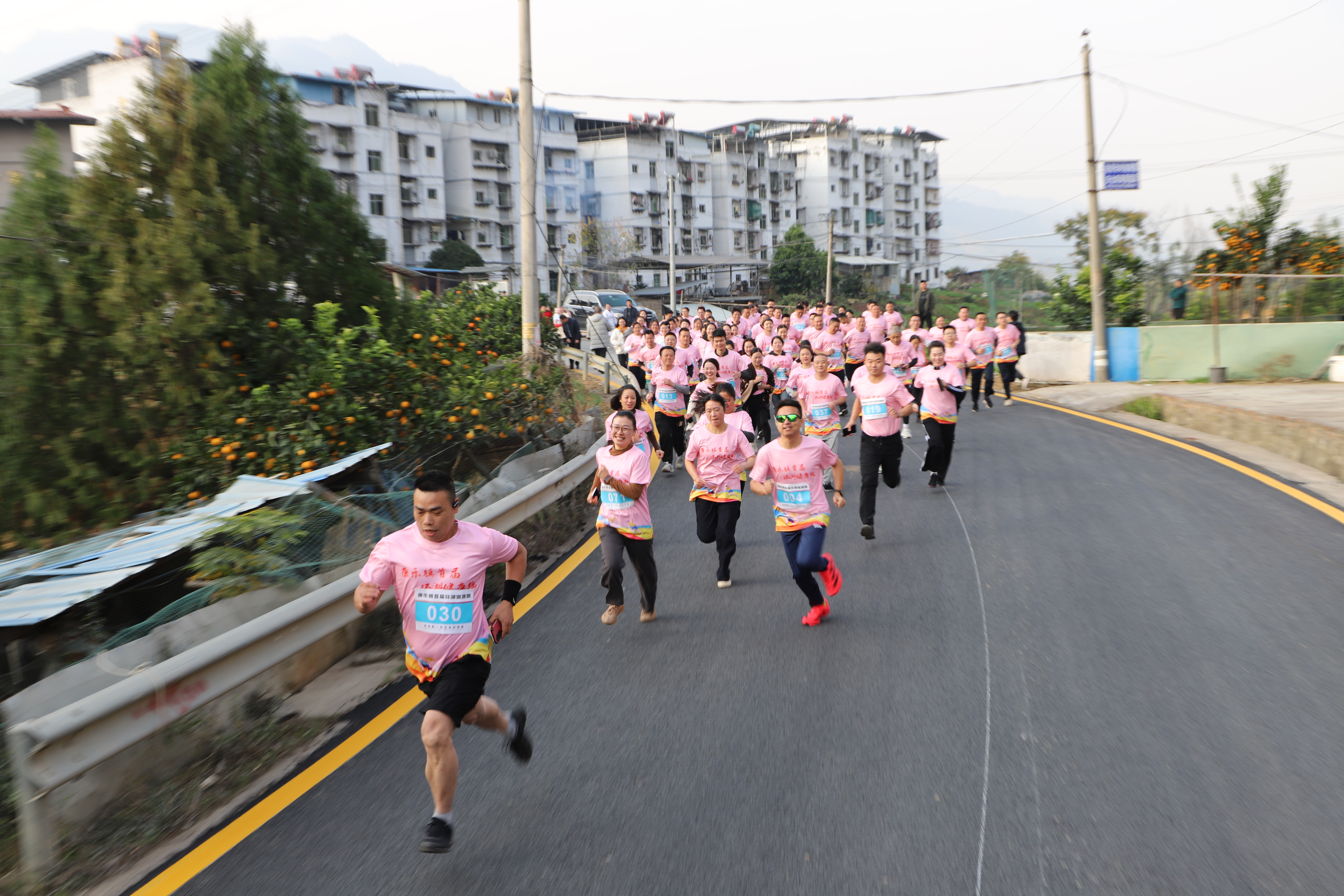 赛道沿康乐湖蜿蜒延伸,串联起成片的金黄橙园与整洁靓丽的乡村新居。参赛者们精神抖擞、斗志昂扬,耳畔是呼啸的风声与加油呐喊,眼前是层林尽染的山水美景,脚下是平坦通畅的乡村大道。大家或并肩冲刺、或相互鼓劲,汗水浸湿衣衫却笑容依旧,奔跑的身影与沿途的橙香、湖光相映成趣,构成一幅动感十足的乡村振兴画卷。