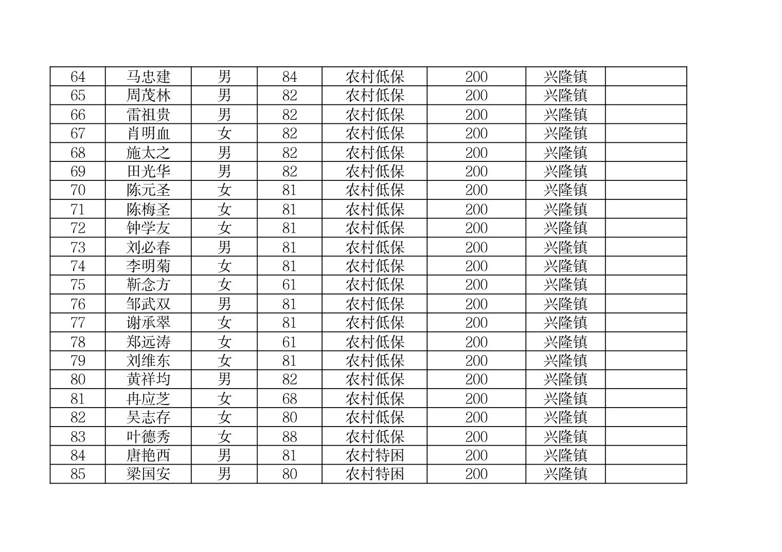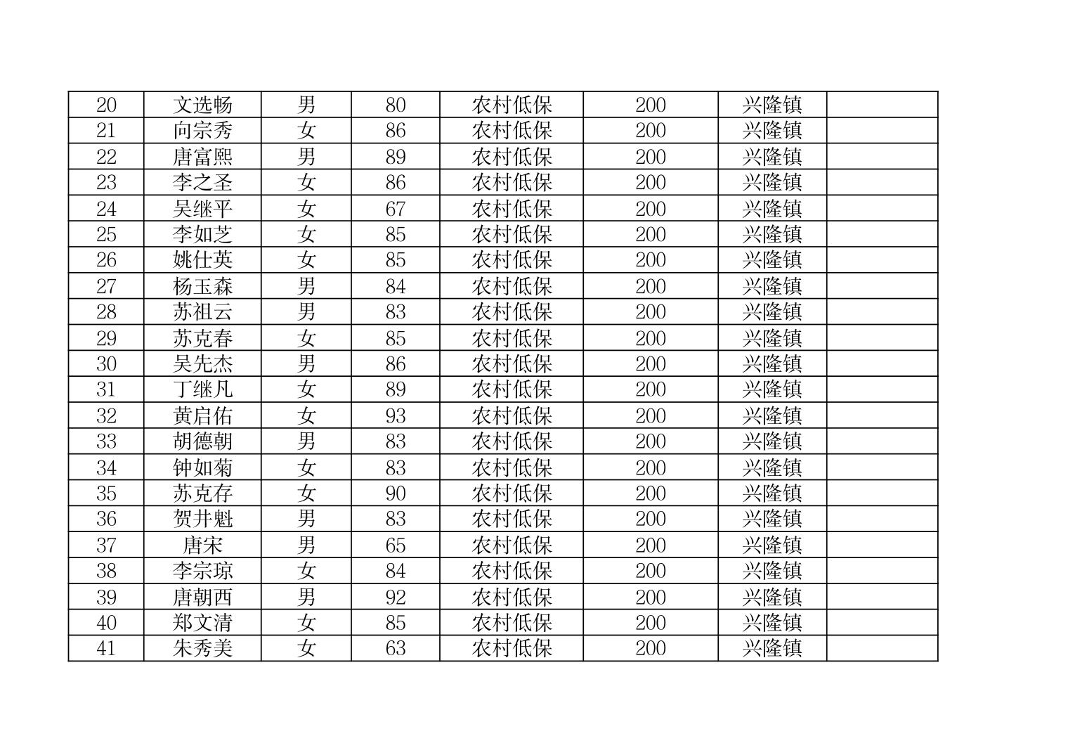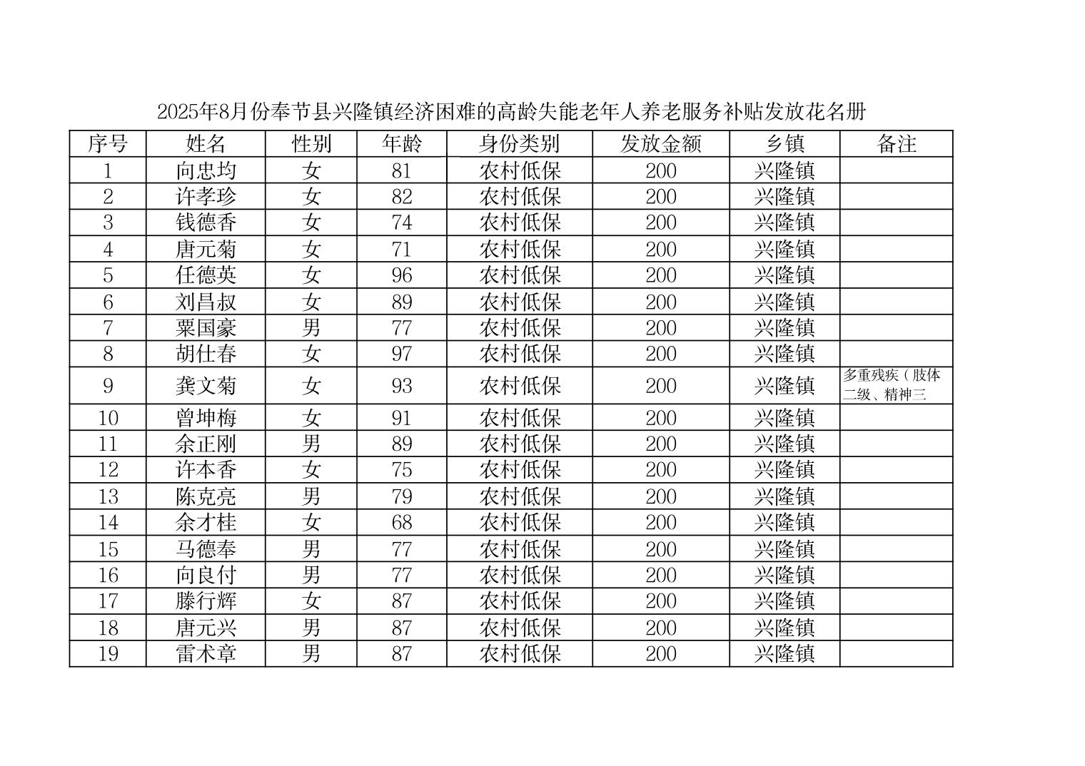 2025年8月份奉节县兴隆镇经济困难的高龄失能老年人养老服务补贴发放花名册