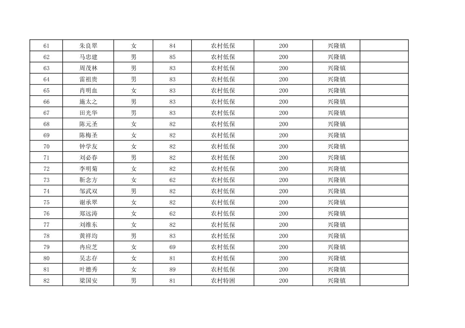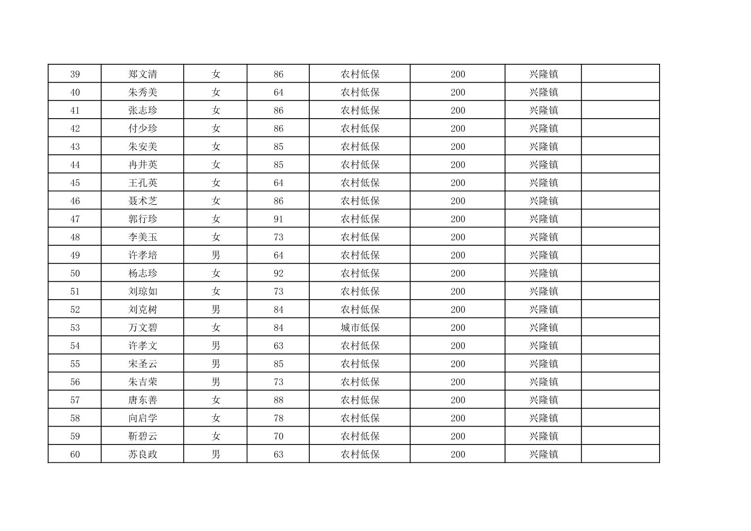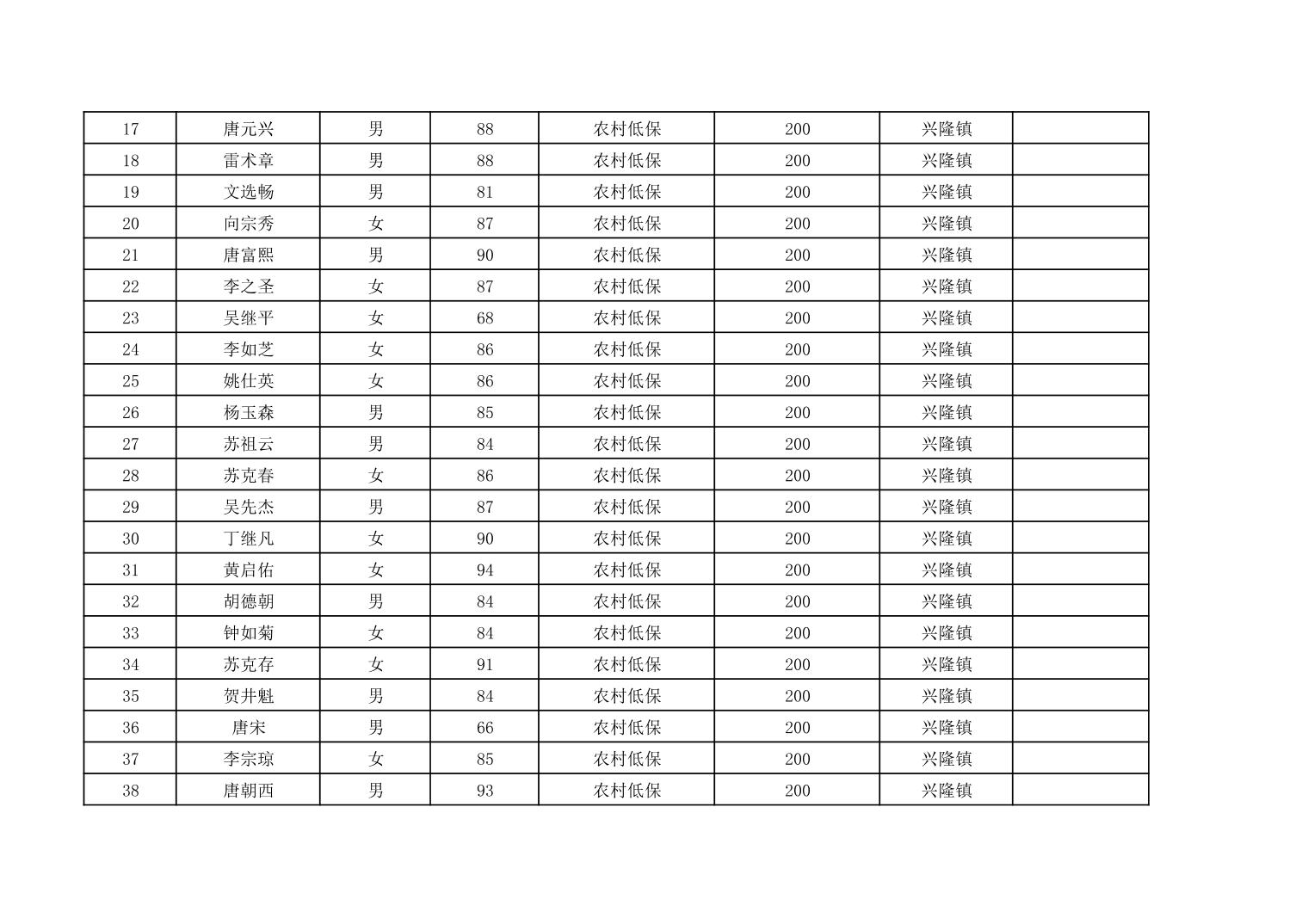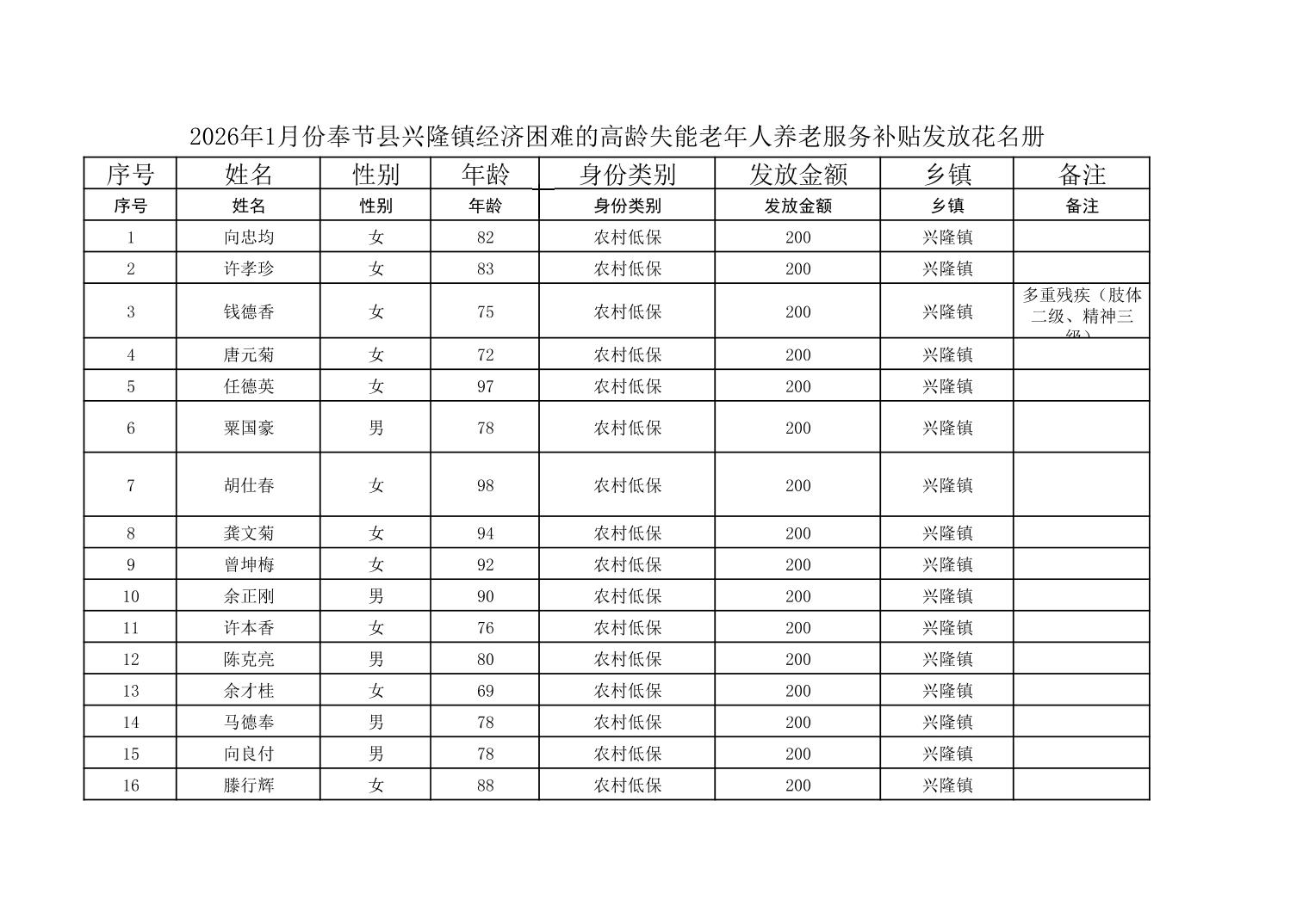 2026年1月份奉节县兴隆镇经济困难的高龄失能老年人养老服务补贴发放花名册