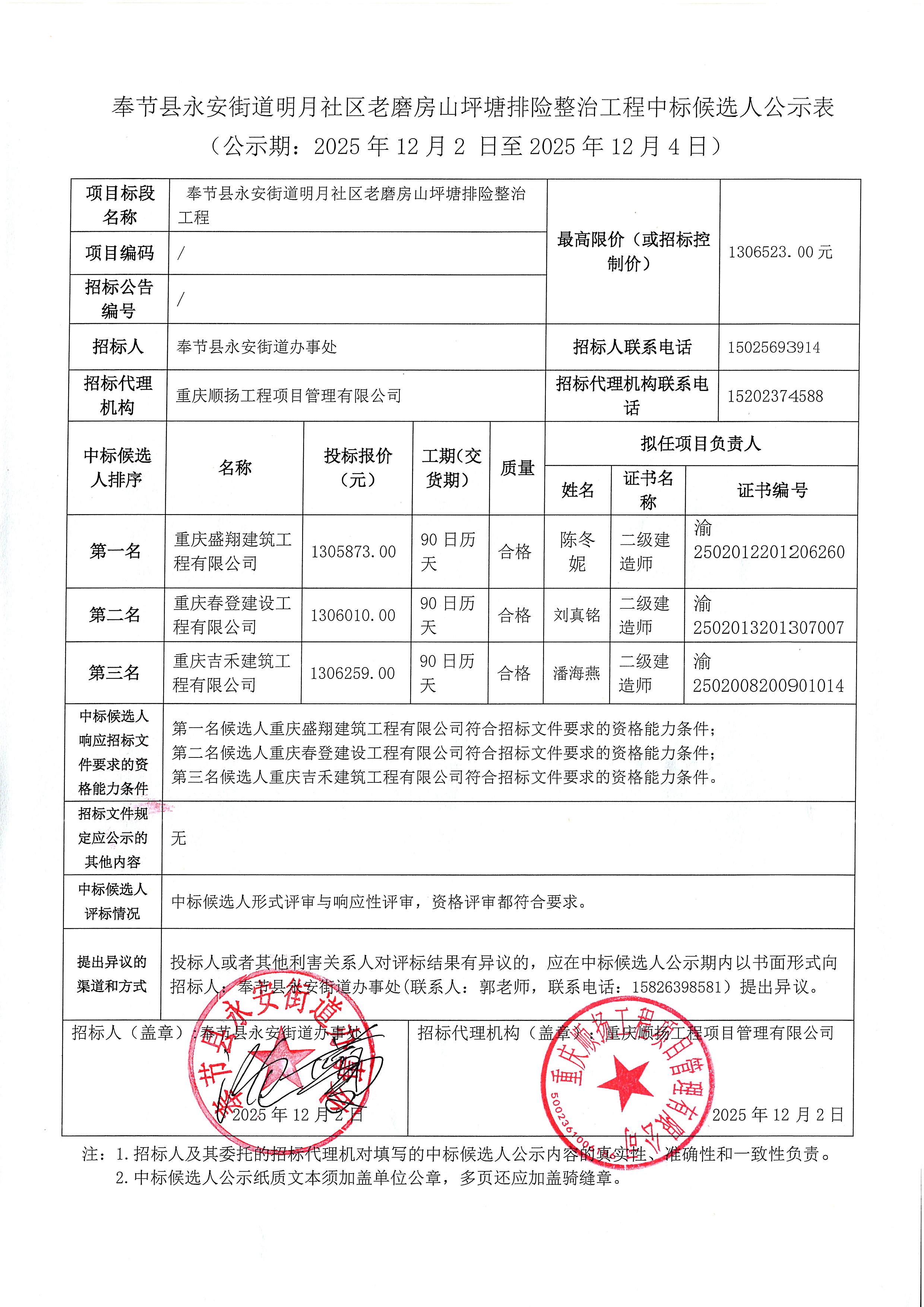 奉节县永安街道明月社区老磨房山坪塘排险整治工程中标候选人公示表