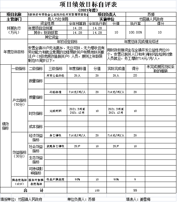 以上为选取的部分项目绩效目标自评表,2021年项目自评表见重庆市竹园镇人民政府网(http://www.cqfj.gov.cn/xz_168/zyz/)政务公开-法定主动公开内容-预算/决算-奉节县竹园镇人民政府 2021年度项目绩效目标公开说明附件。