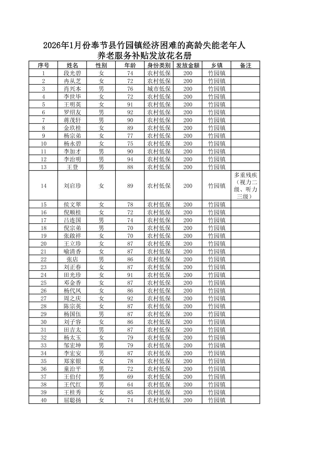 2026年1月份奉节县竹园镇经济困难的高龄失能老年人 养老服务补贴发放花名册