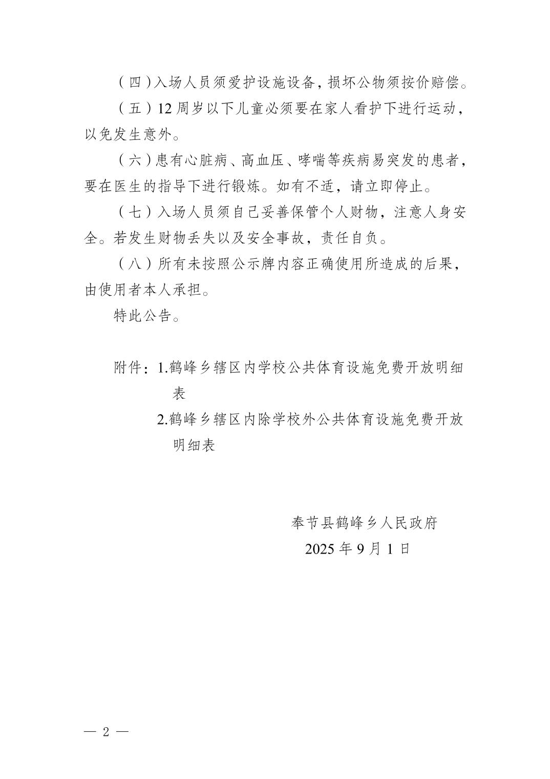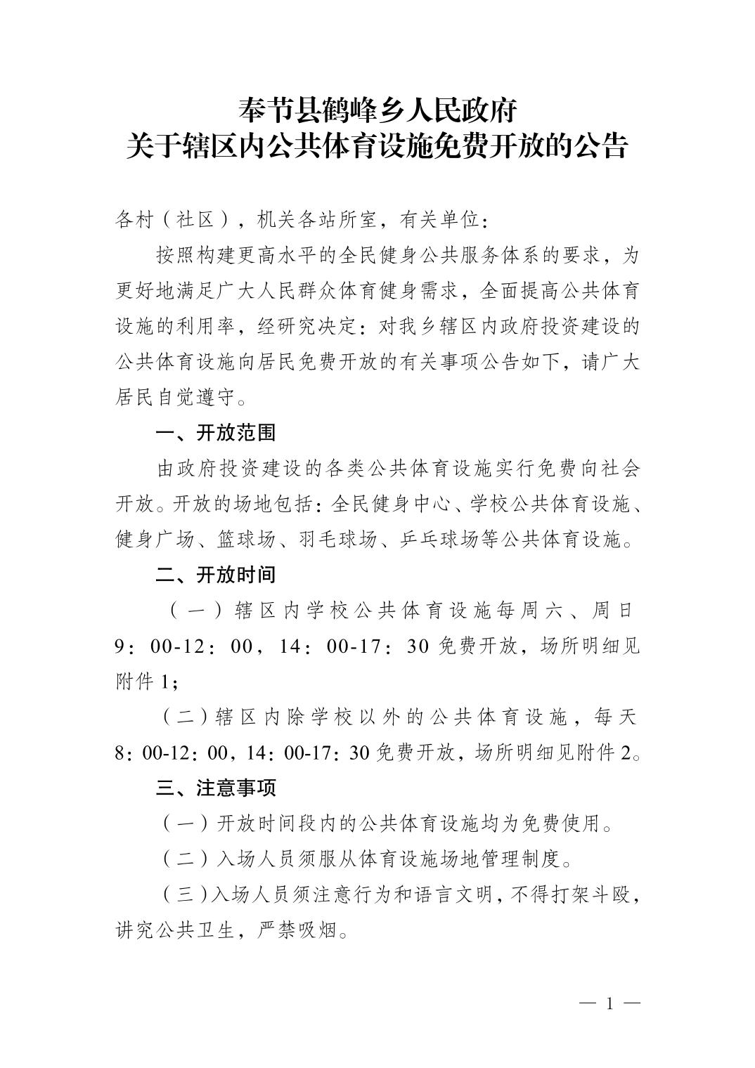 奉节县鹤峰乡人民政府关于辖区内公共体育设施免费开放的公告