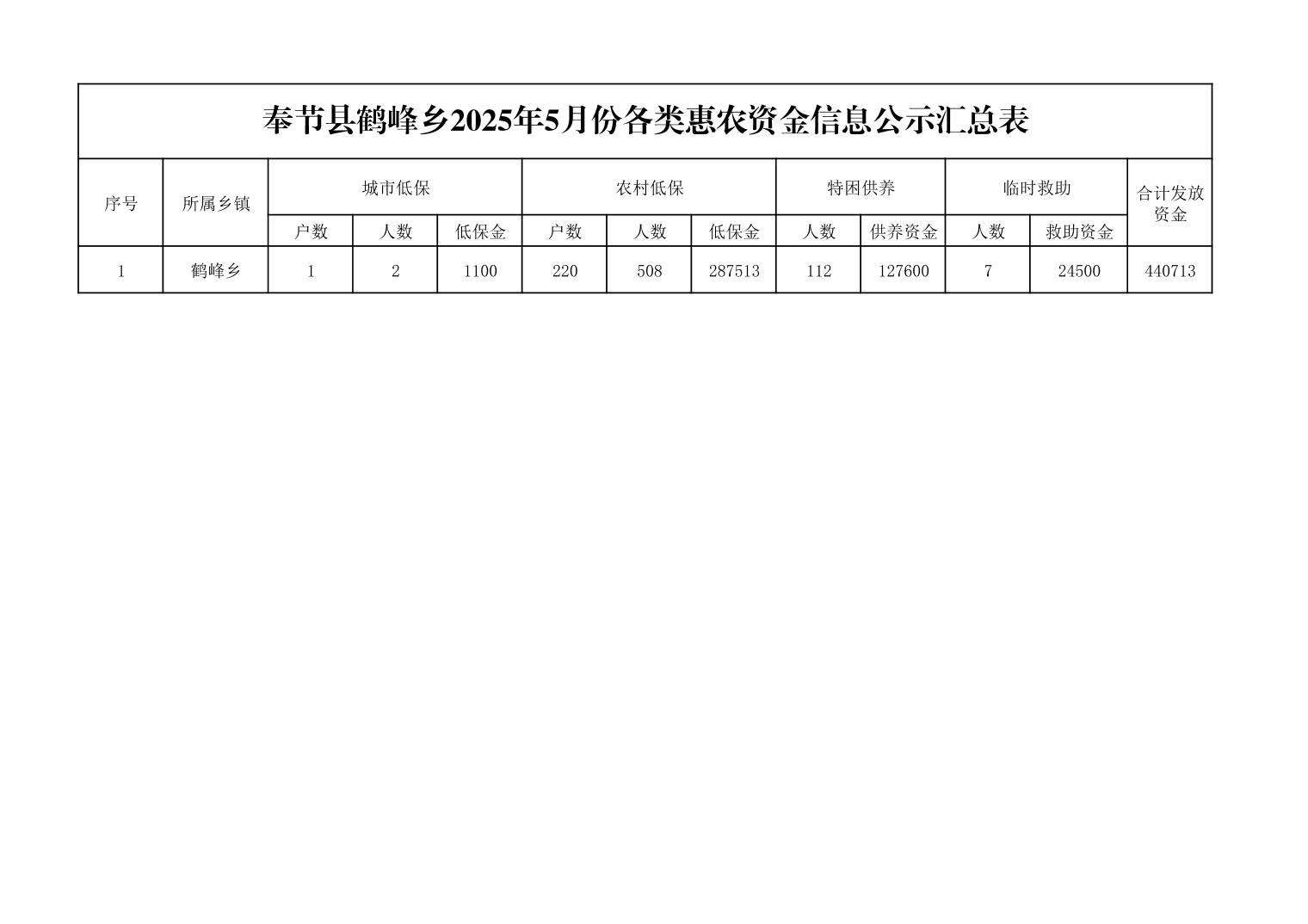 奉节县鹤峰乡2025年5月份各类惠农资金信息公示汇总表