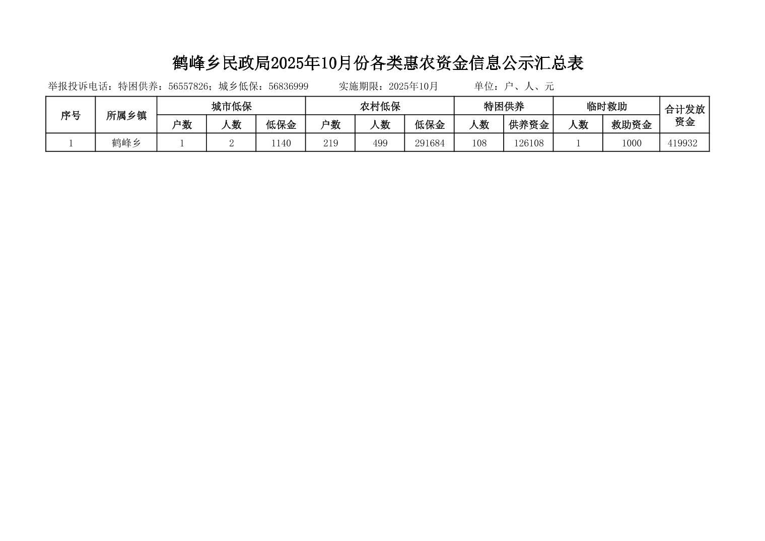 鹤峰乡2025年10月份各类惠农资金信息公示汇总表