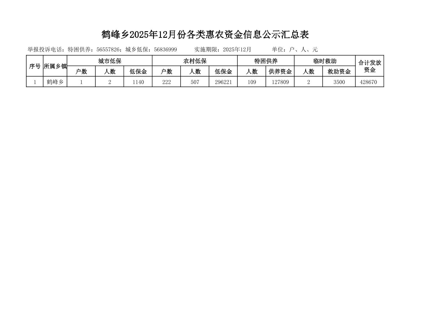鹤峰乡2025年12月份各类惠农资金信息公示汇总表