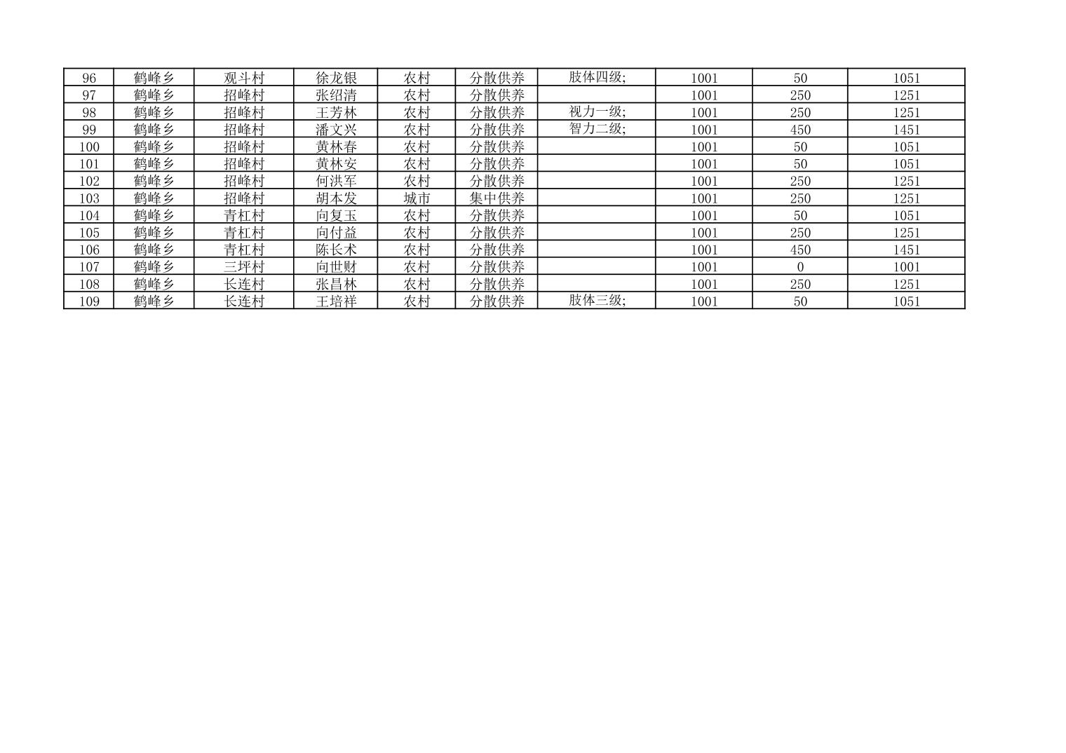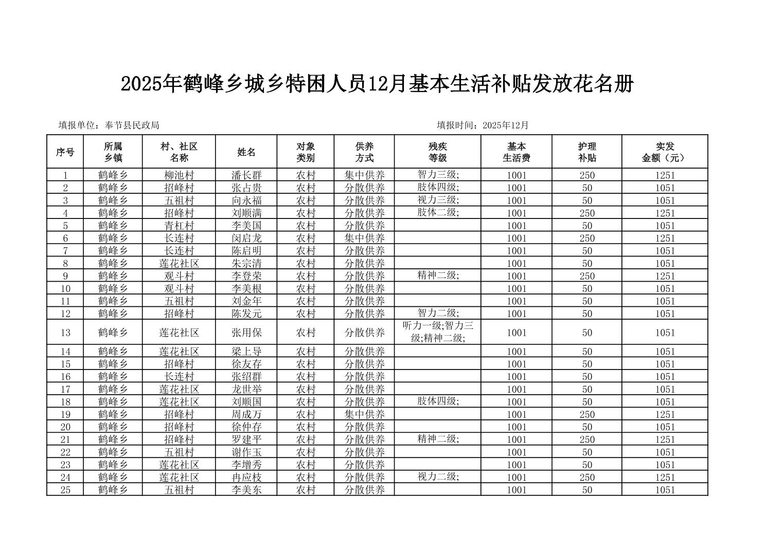 鹤峰乡2025年城乡特困人员12月基本生活补贴发放花名册