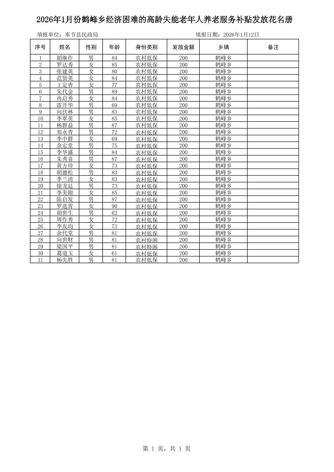 2026年1月份鹤峰乡经济困难的高龄失能老年人养老服务补贴发放花名册