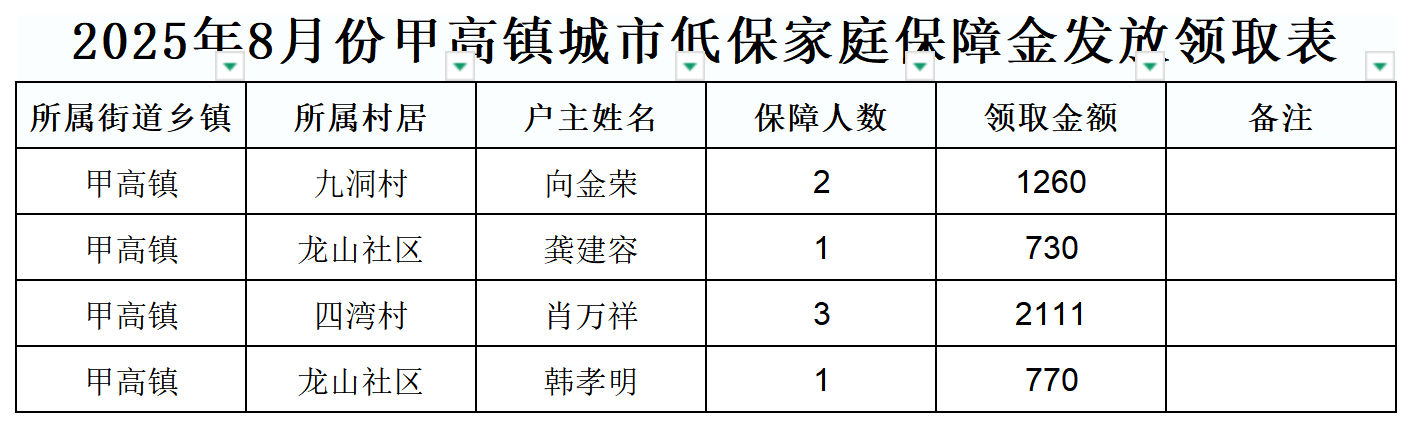 2025年8月份甲高镇城市低保家庭保障金发放领取表