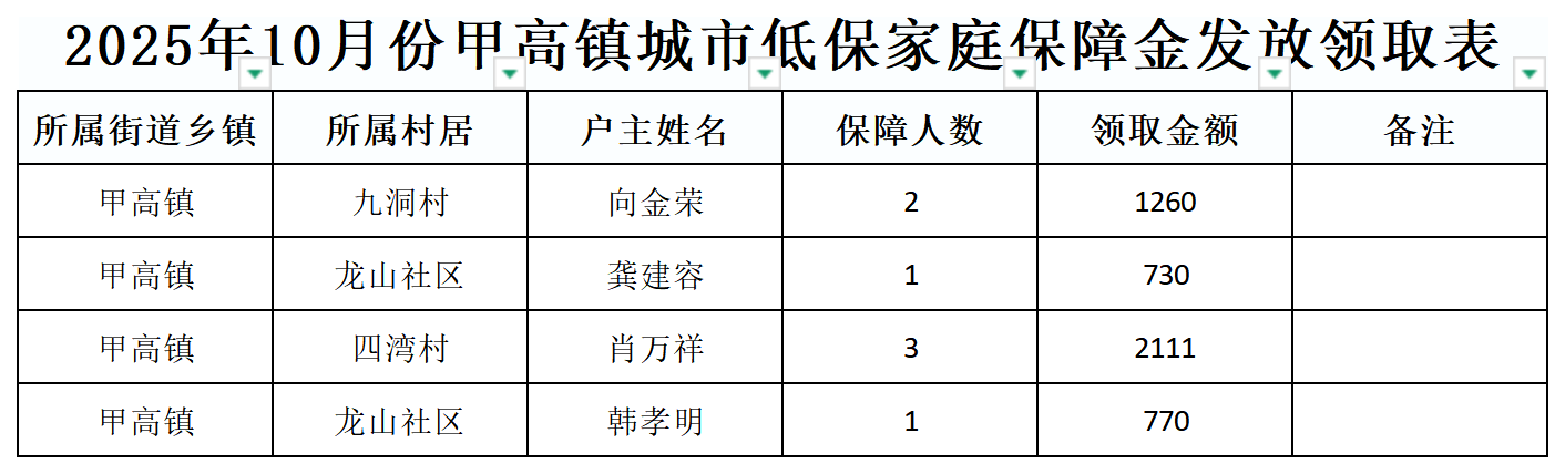 2025年10月份甲高镇城市低保家庭保障金发放领取表
