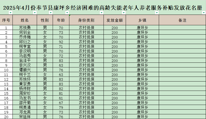2025年4月份奉节县康坪乡经济困难的高龄失能老年人养老服务补贴发放花名册