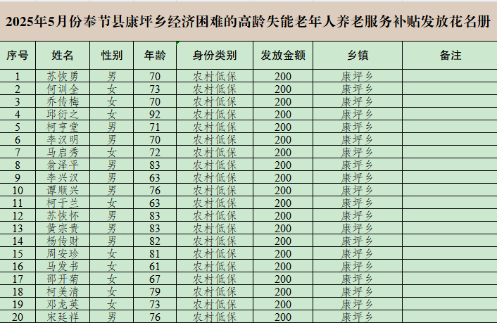 2025年5月份奉节县康坪乡经济困难的高龄失能老年人养老服务补贴发放花名册