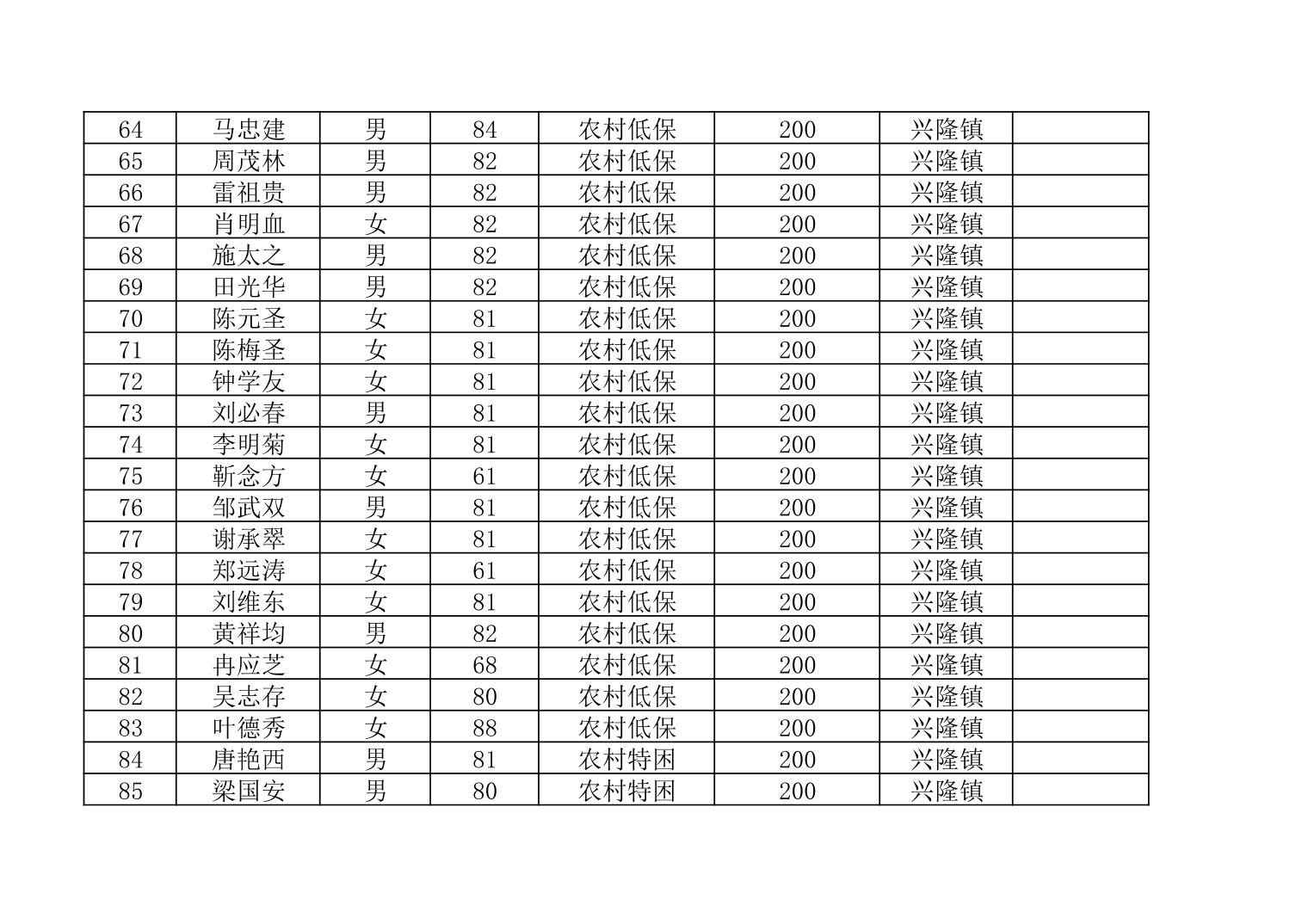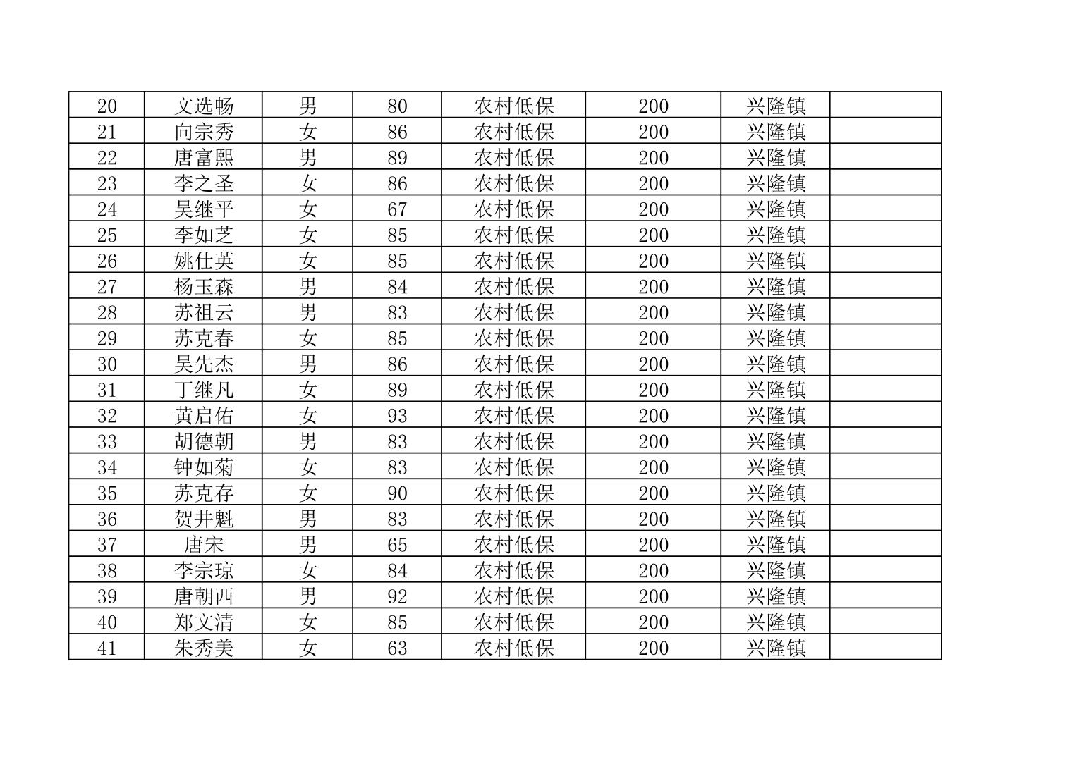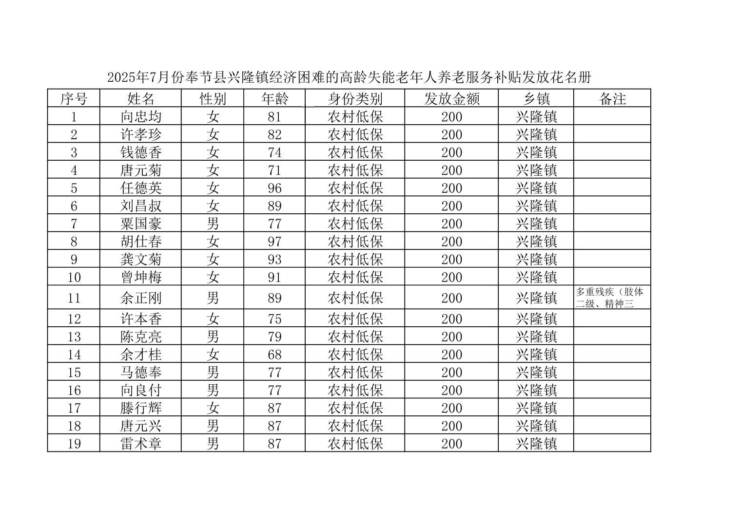 2025年7月份奉节县兴隆镇经济困难的高龄失能老年人养老服务补贴发放花名册