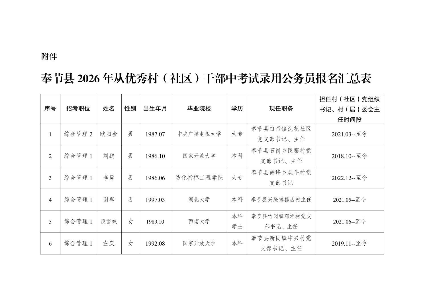 中共奉节县委组织部关于奉节县2026年从优秀村 (社区)干部中考试录用公务员报名人员公示