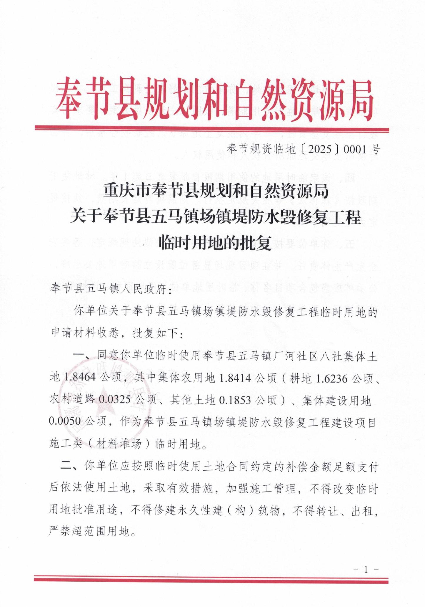 奉节县规划和自然资源局关于奉节县五马镇场镇堤防水毁修复工程临时用地的批复