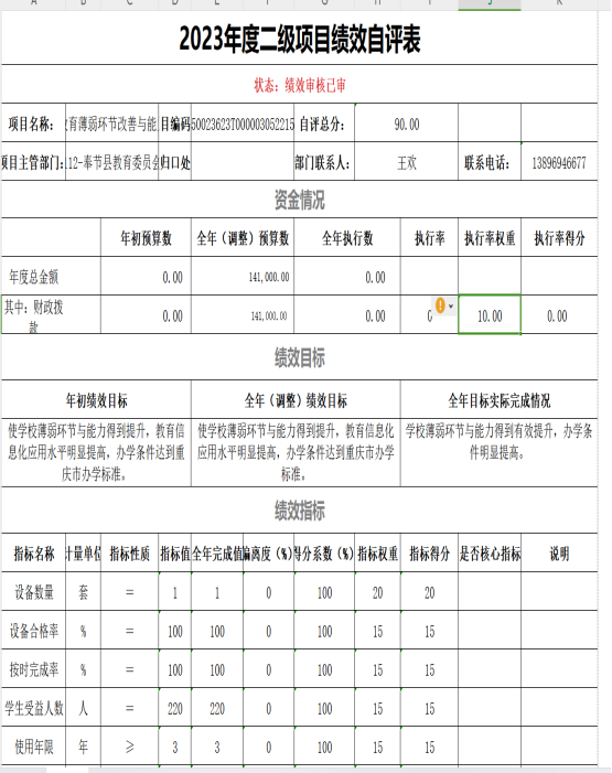 (一)县财政下达项目绩效目标情况。奉节县财政局《关于下达2023年薄弱学校改善与能力提升项目资金的通知》(奉节财行〔2022〕179号文件安排资金8.1万元和〔2023〕128号文件安排资金6万元,资金合计14.1万元),在下达资金预算时同步下达了绩效目标。一个项目有两个类别:一个是购置费,一个是电子白板费,所以有两个文件,我们根据总的绩效目标开展自评。
