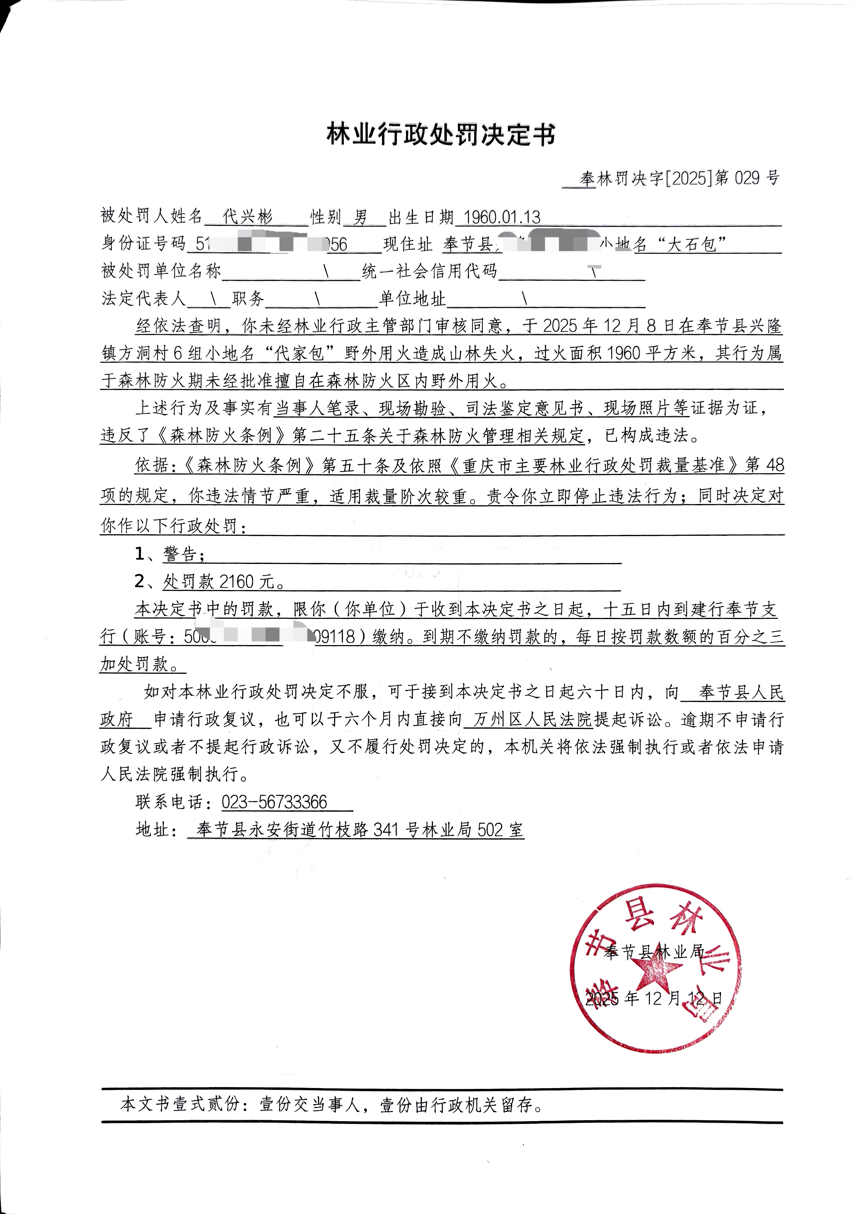 违规野外用火行政处罚结果