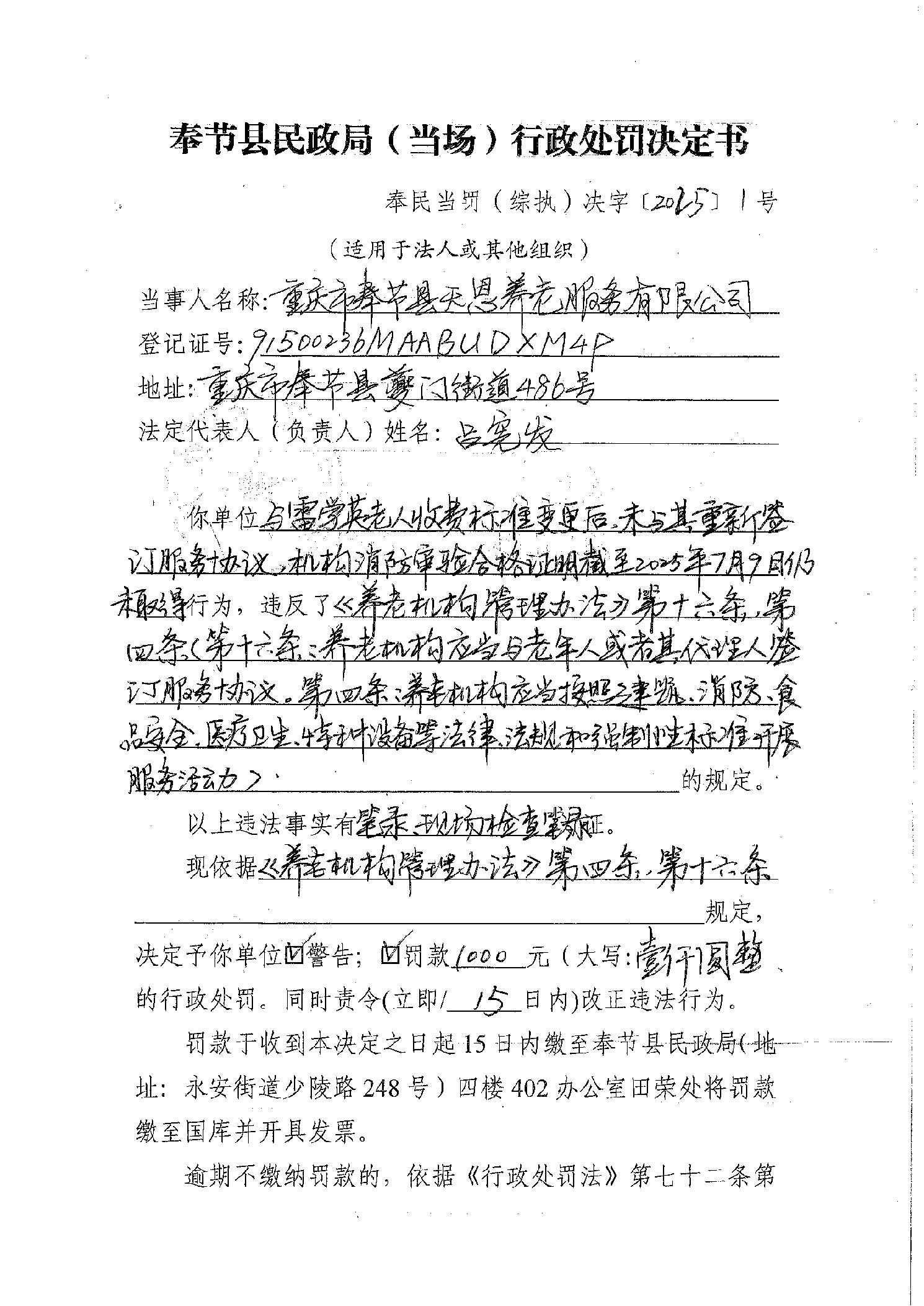 奉节县民政局行政处罚决定书