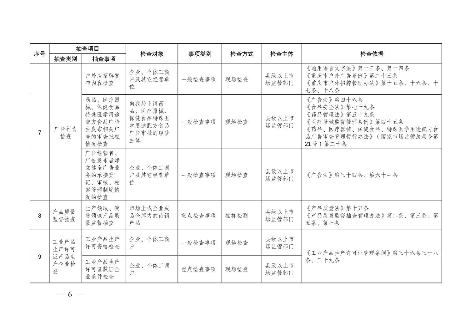 重庆市市场监督管理局办公室关于印发“双随机、一公开”抽查事项清单 (第二版)的通知