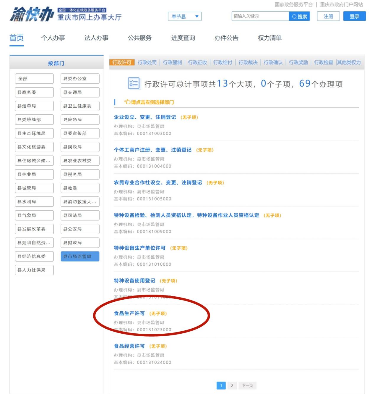 重庆市奉节县市场监督管理局食品生产许可服务指南已在渝快办上发布,网址:http://zwfw.cq.gov.cn/fjx/govservice/powerlist