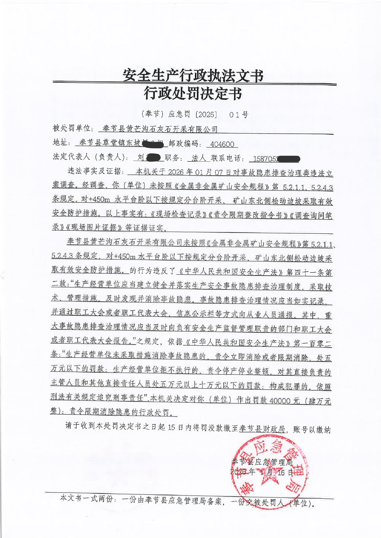 行政处罚决定书(奉节县黄芒沟石灰石开采有限公司)