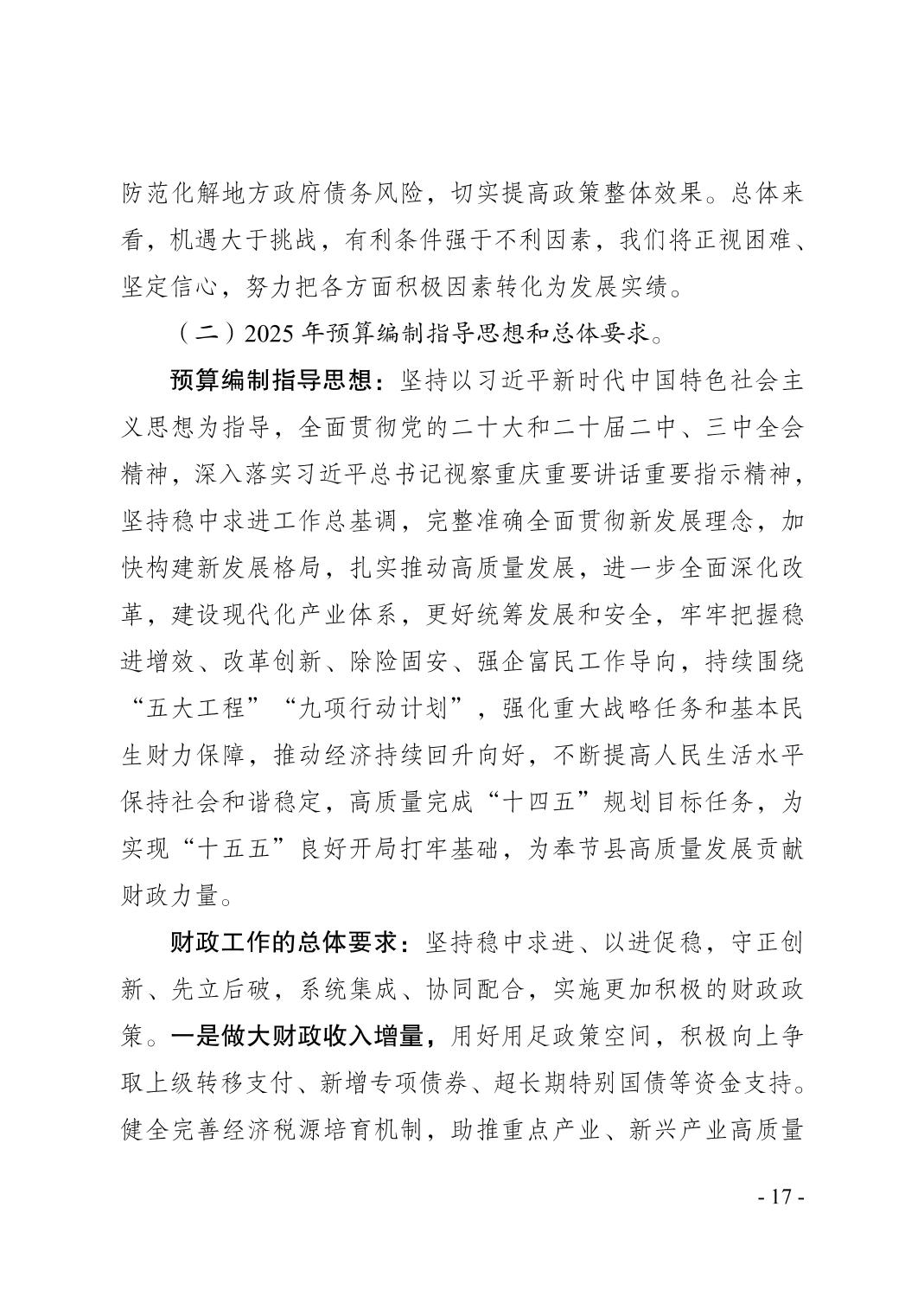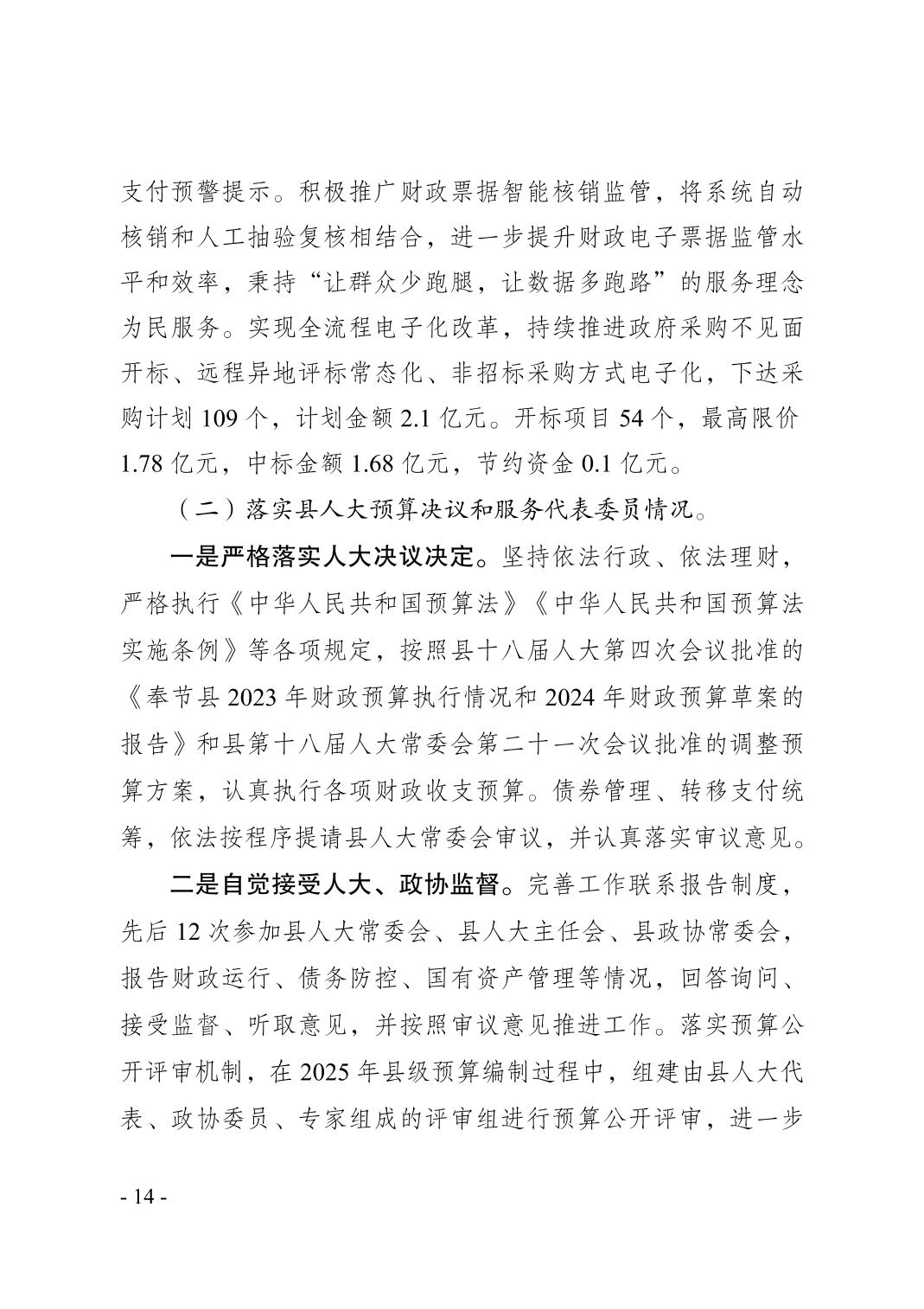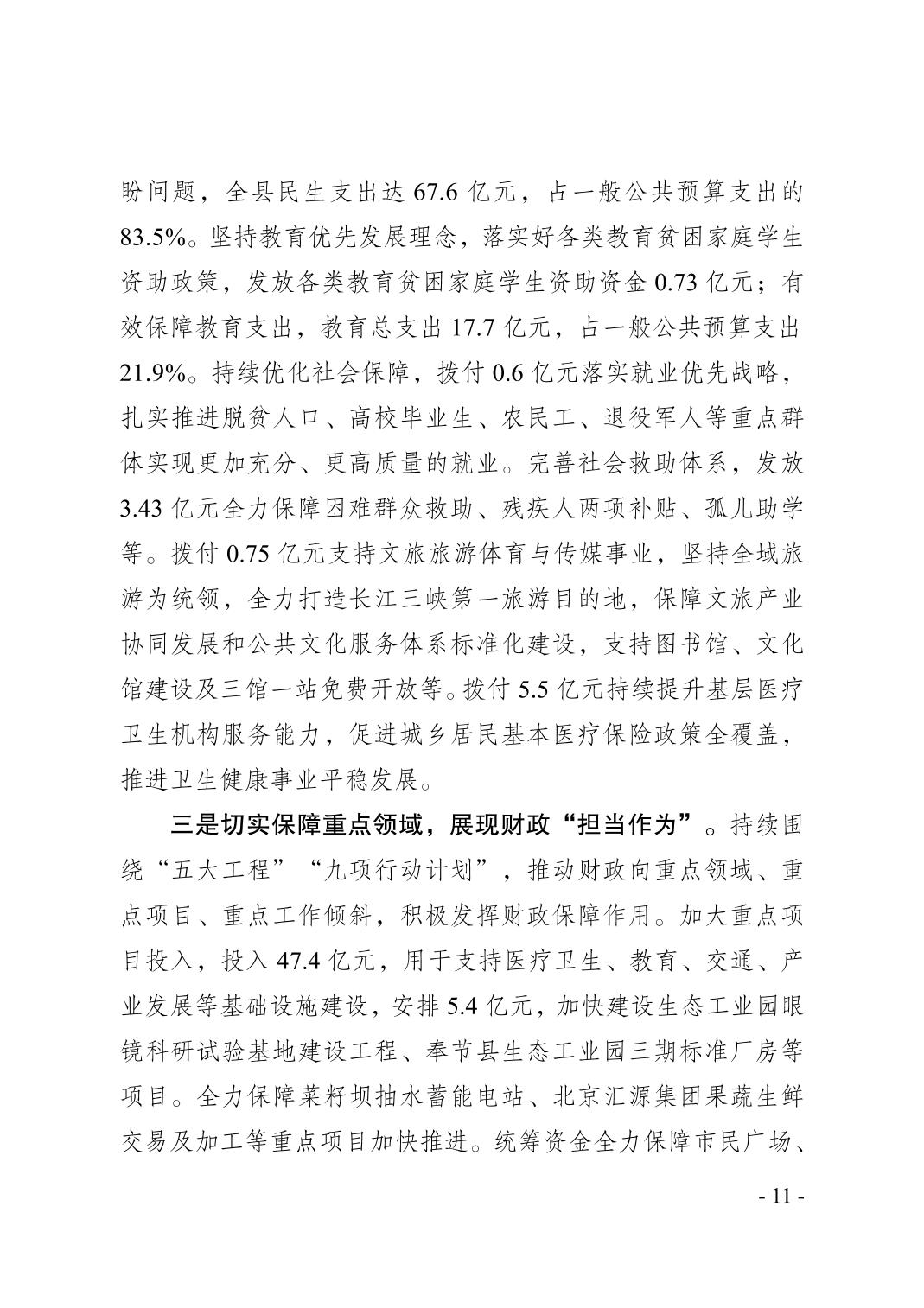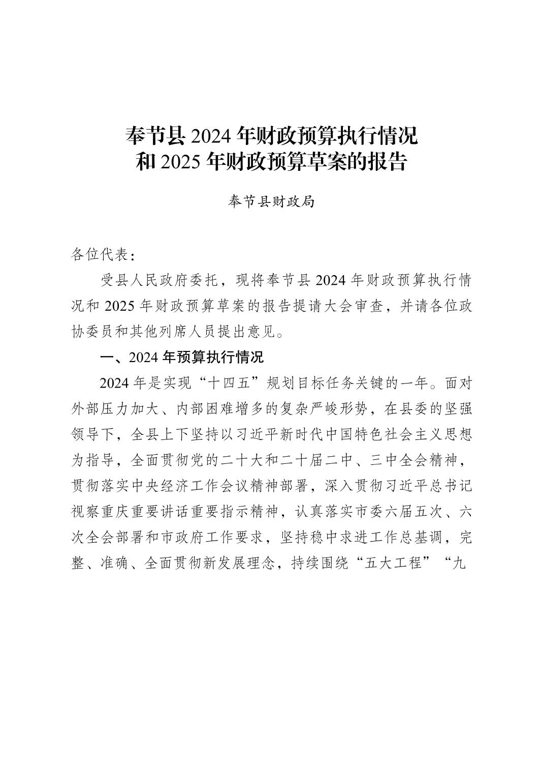 奉节县2024年财政预算执行情况和2025年财政预算草案的报告