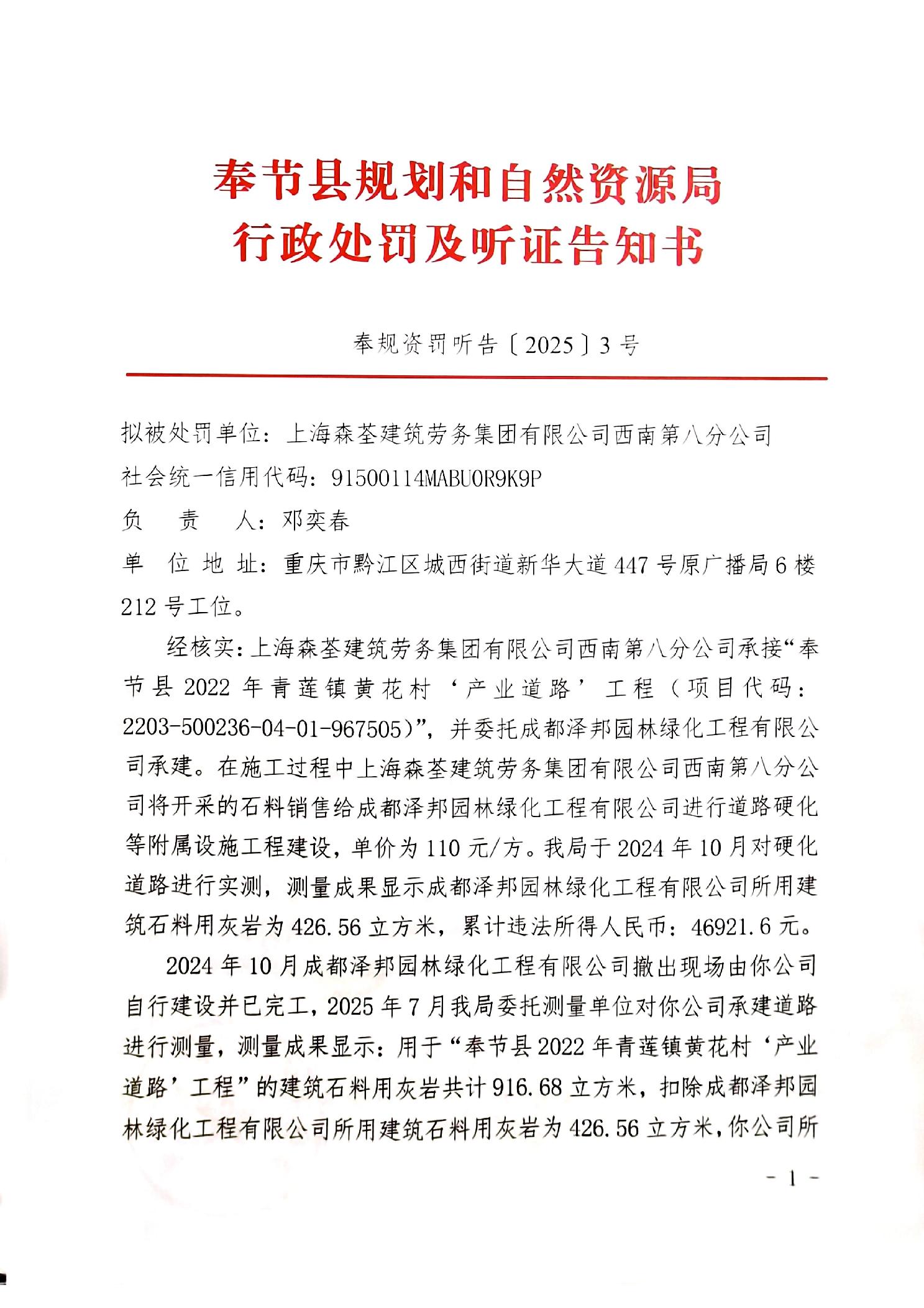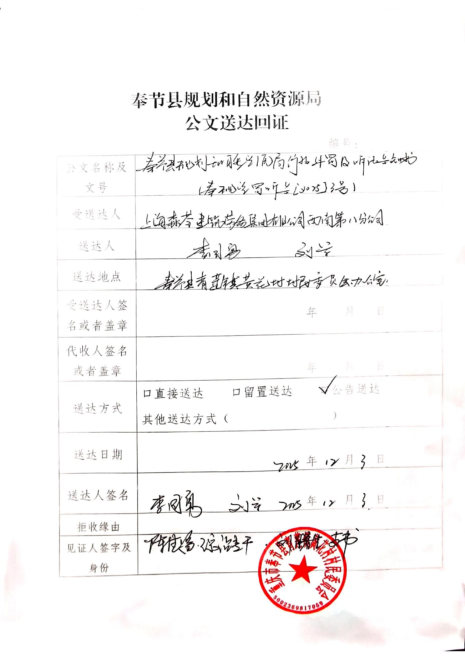 奉节县规划和自然资源局行政处罚及听证告知书公告送达