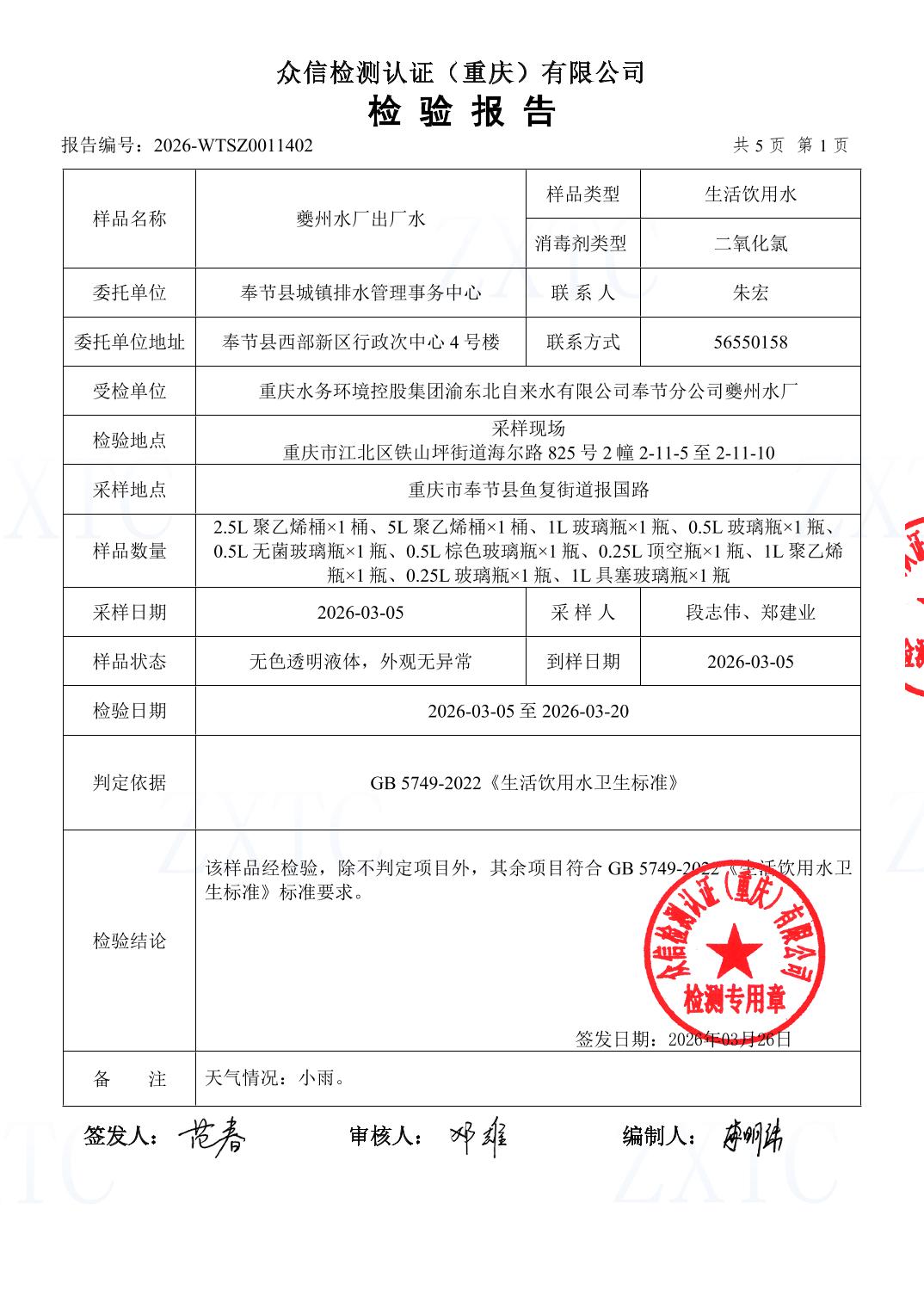 2026年3月城市供水水厂出厂水水质监测结果予以公示