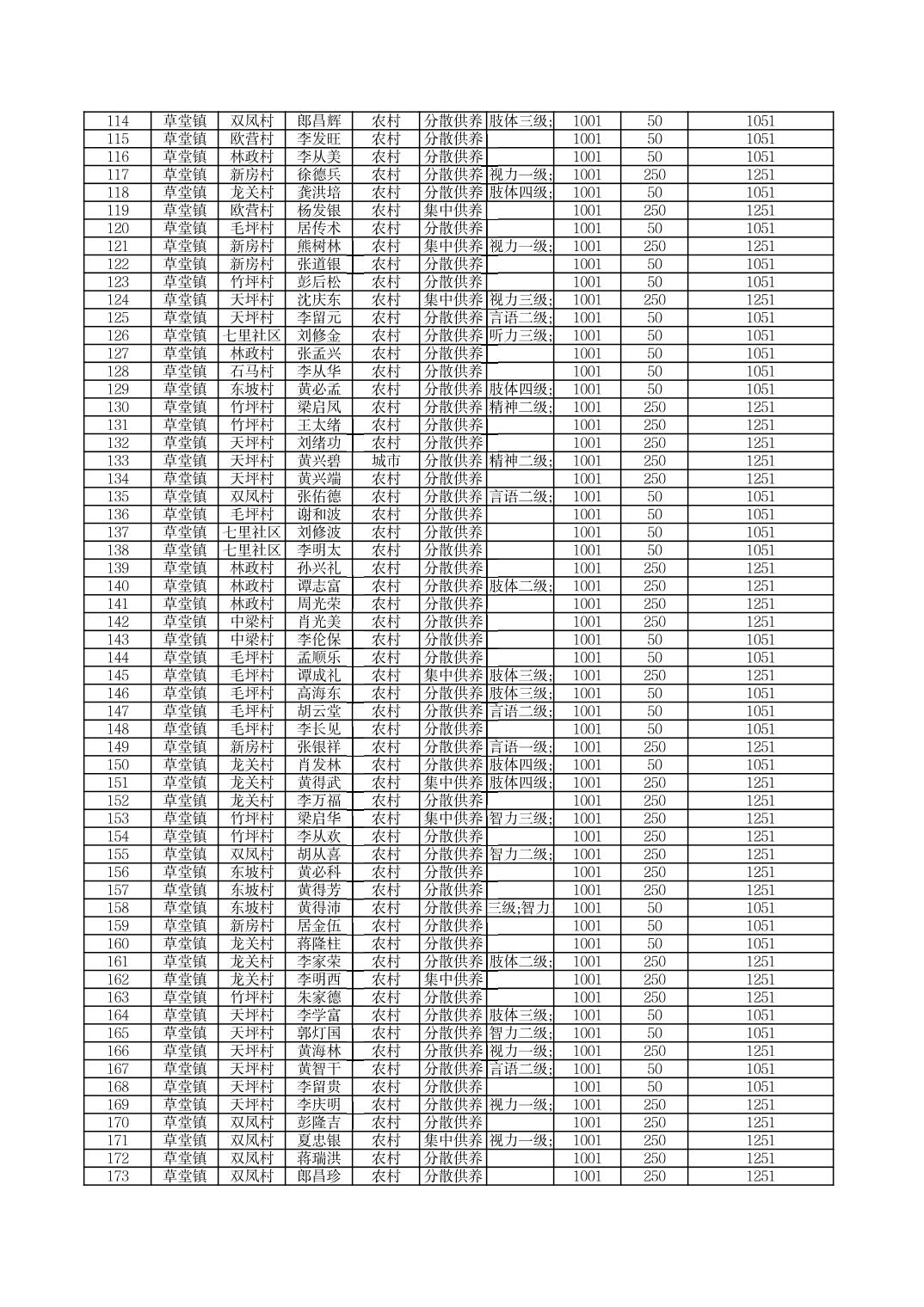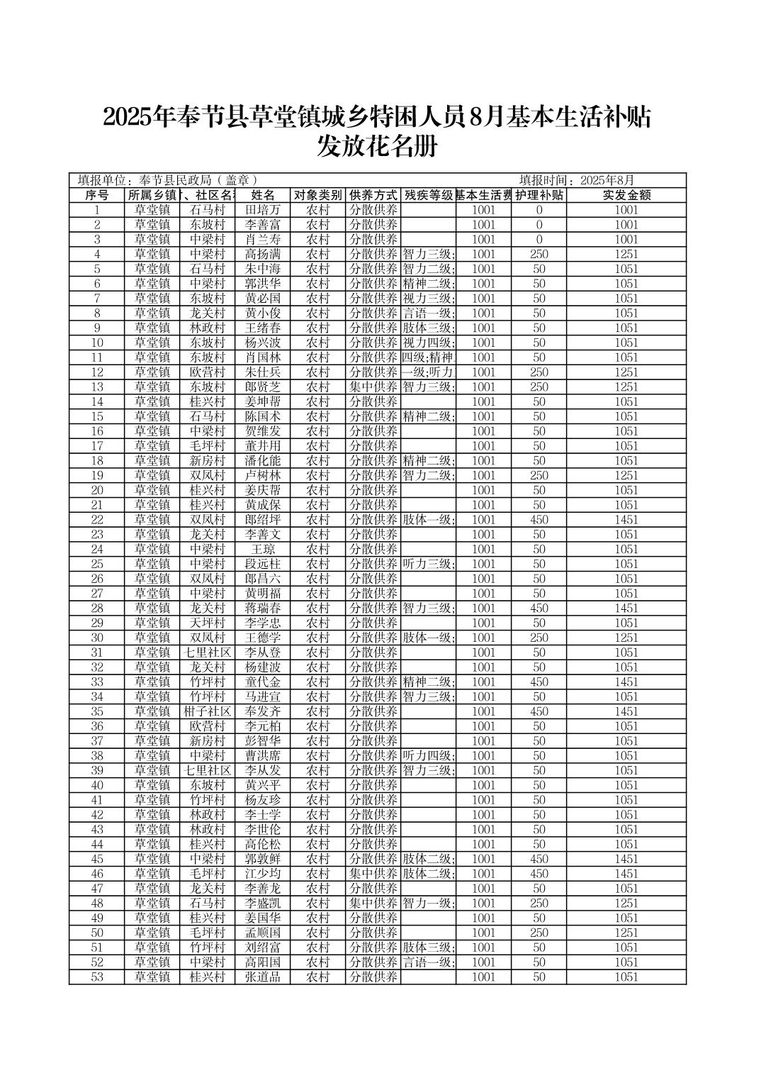 2025年奉节县草堂镇城乡特困人员8月基本生活补贴发放花名册