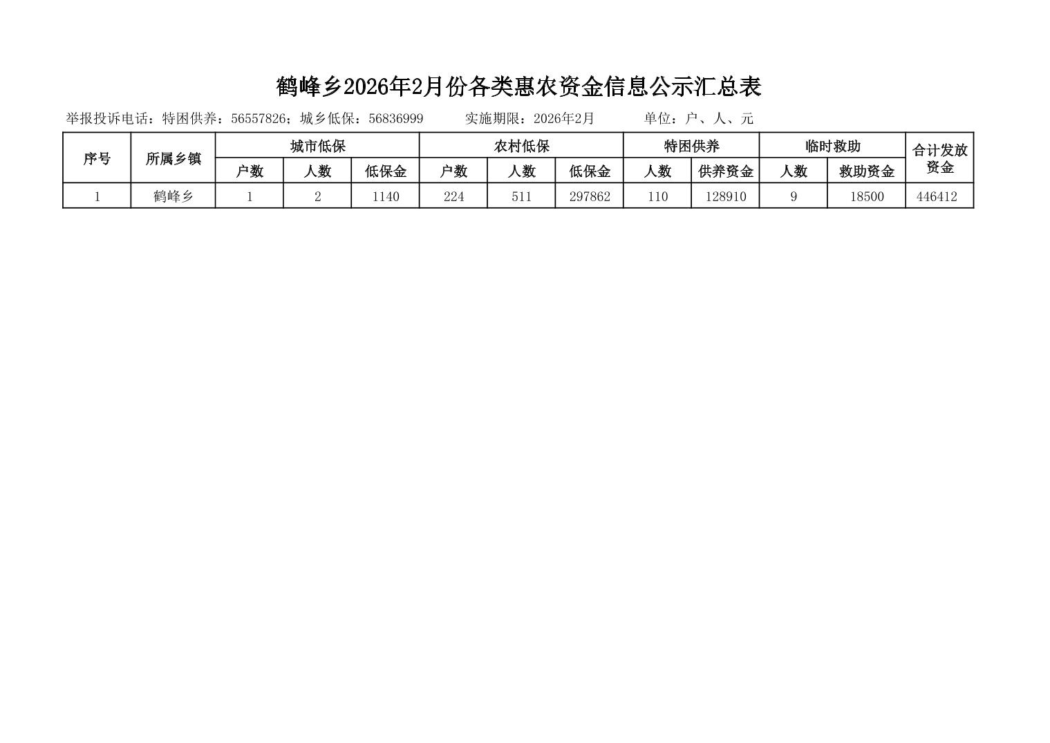 鹤峰乡2026年2月份各类惠农资金信息公示汇总表