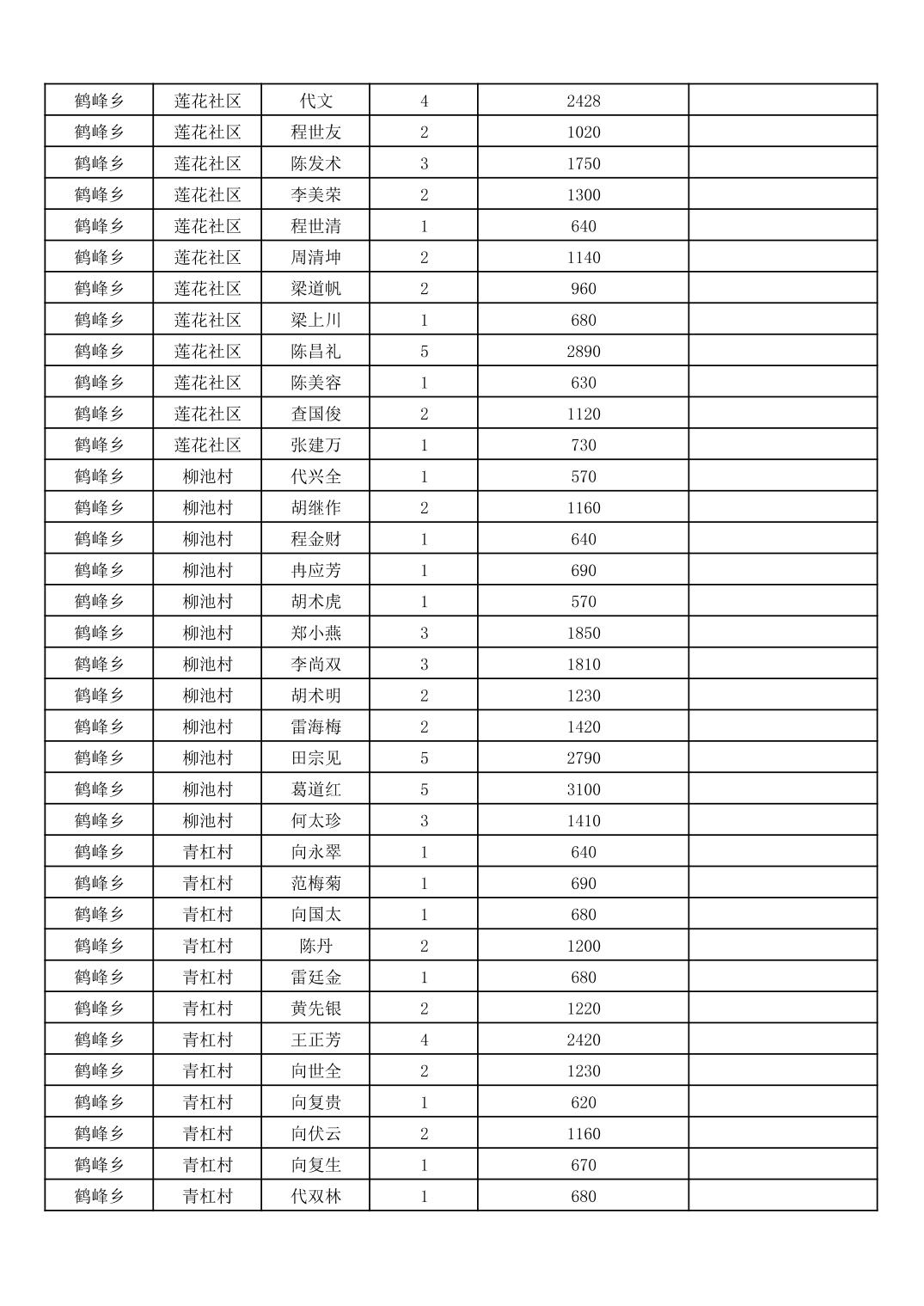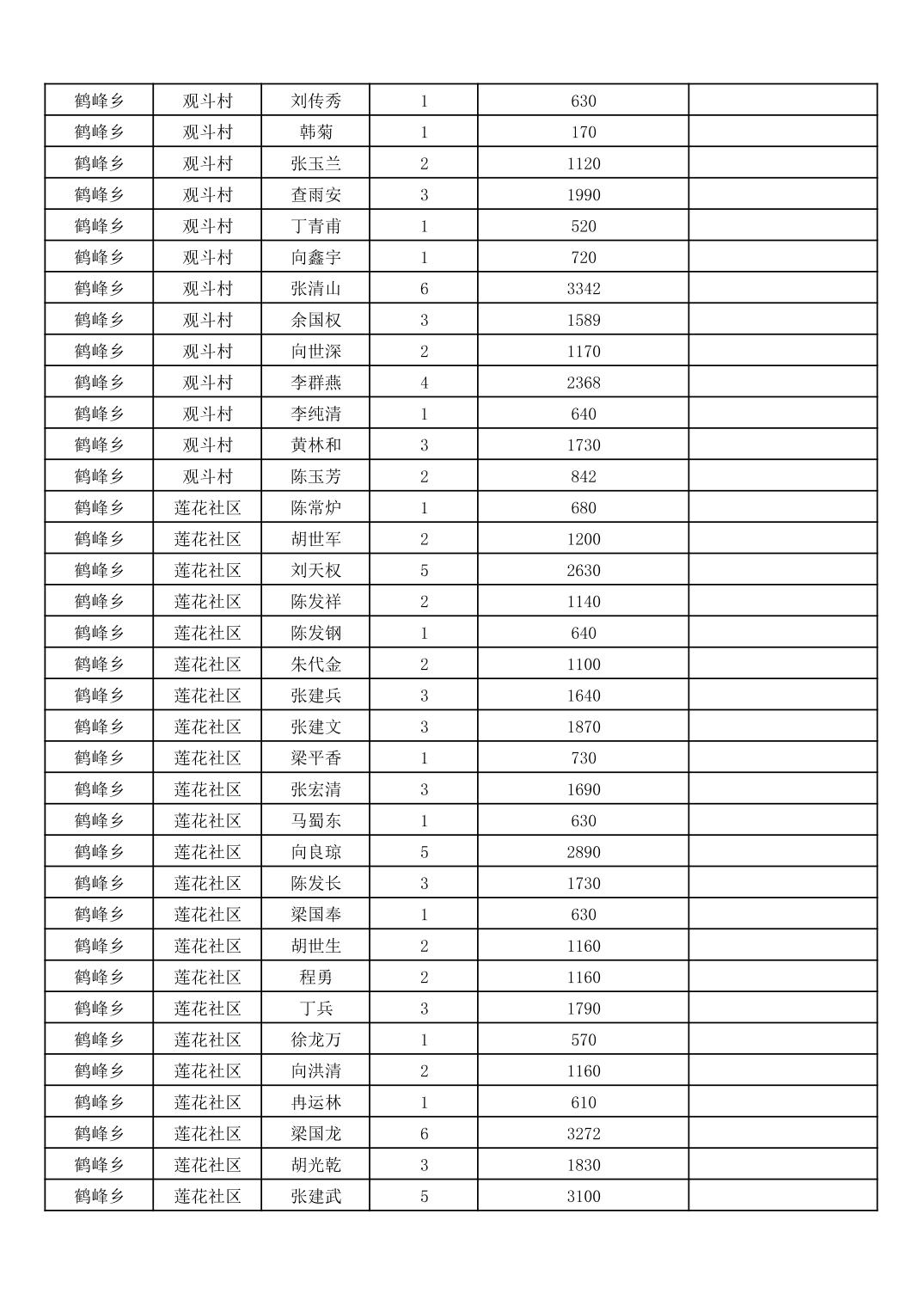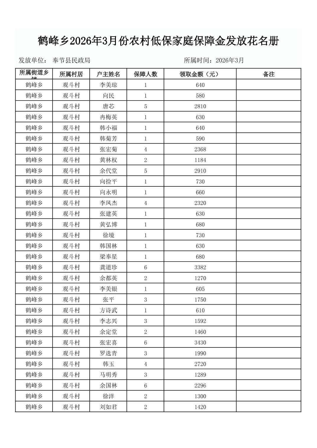 鹤峰乡2026年3月份农村低保家庭保障金发放花名册