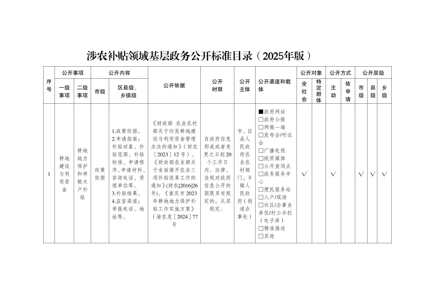 奉节县鹤峰乡涉农补贴领域基层政务公开标准目录(2025年版)