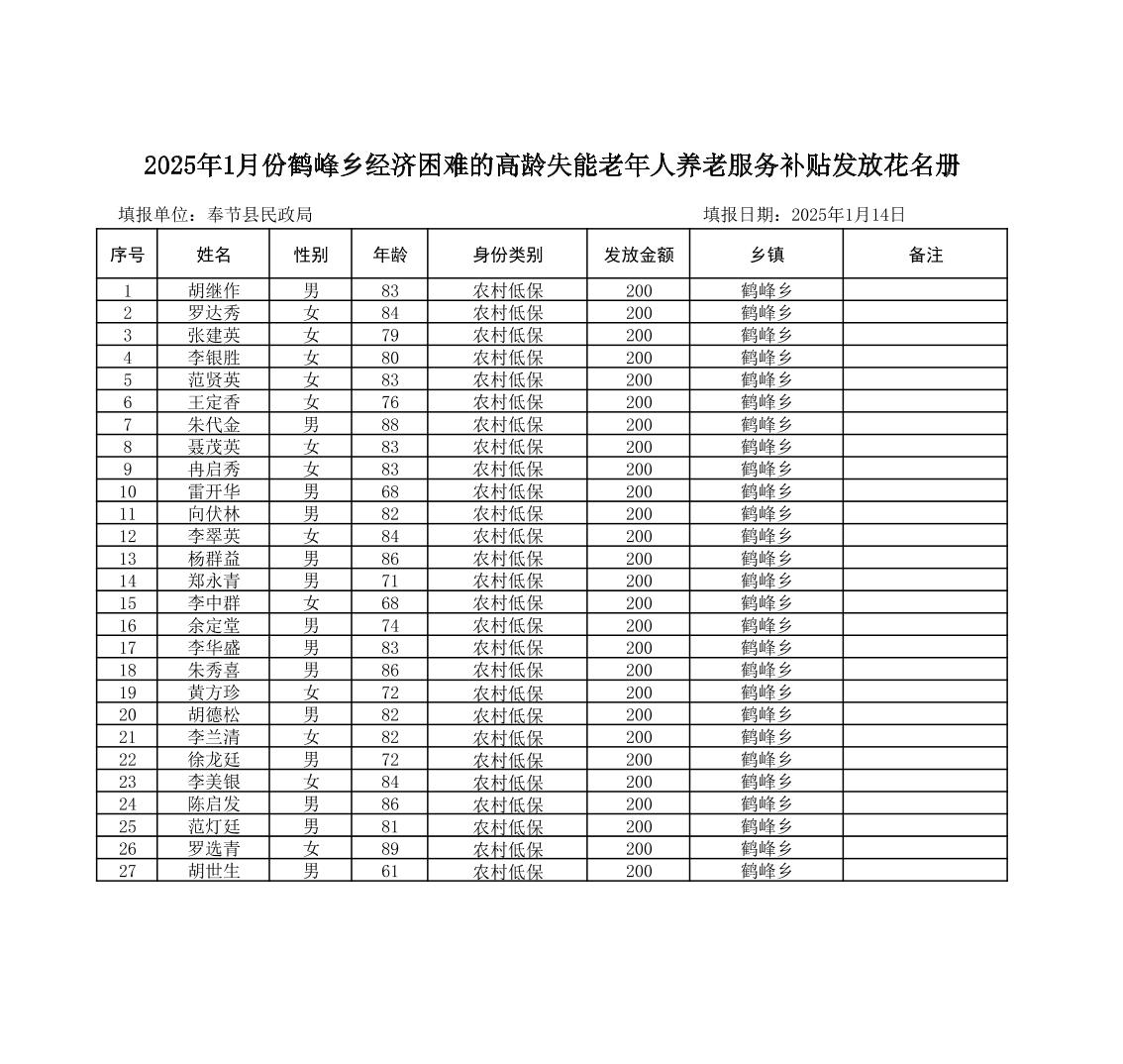 2025年1月份鹤峰乡经济困难的高龄失能老年人养老服务补贴发放花名册