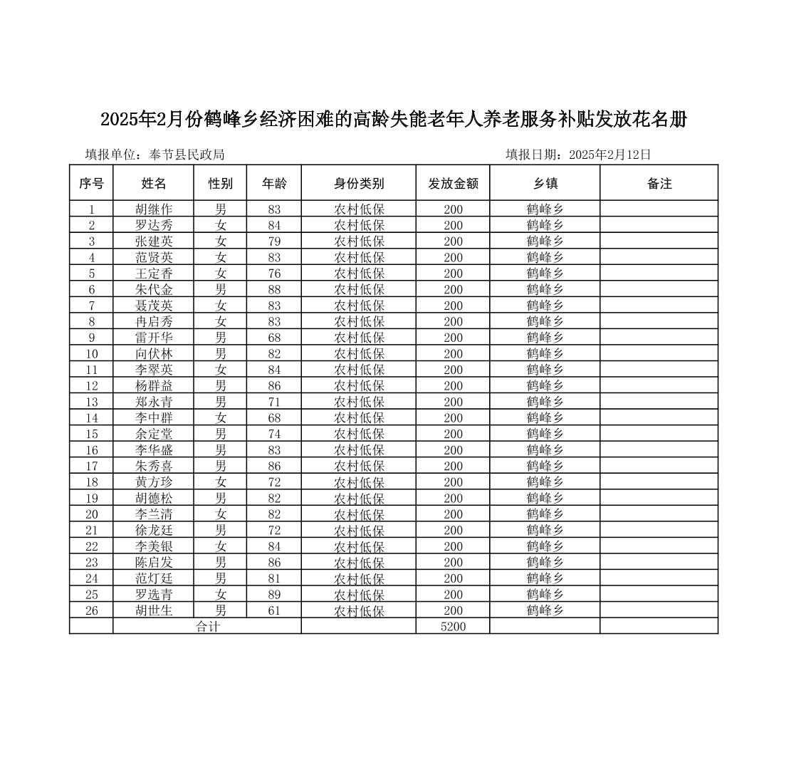 2025年2月份鹤峰乡经济困难的高龄失能老年人养老服务补贴发放花名册