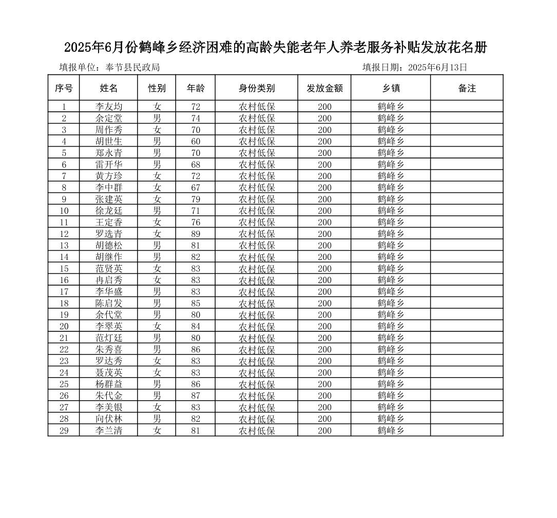 2025年6月份鹤峰乡经济困难的高龄失能老年人养老服务补贴发放花名册