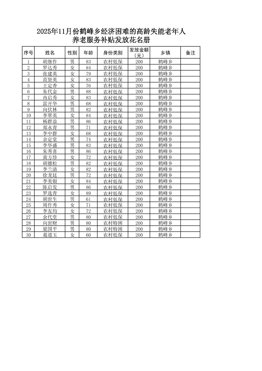 2025年11月份鹤峰乡经济困难的高龄失能老年人养老服务补贴发放花名册