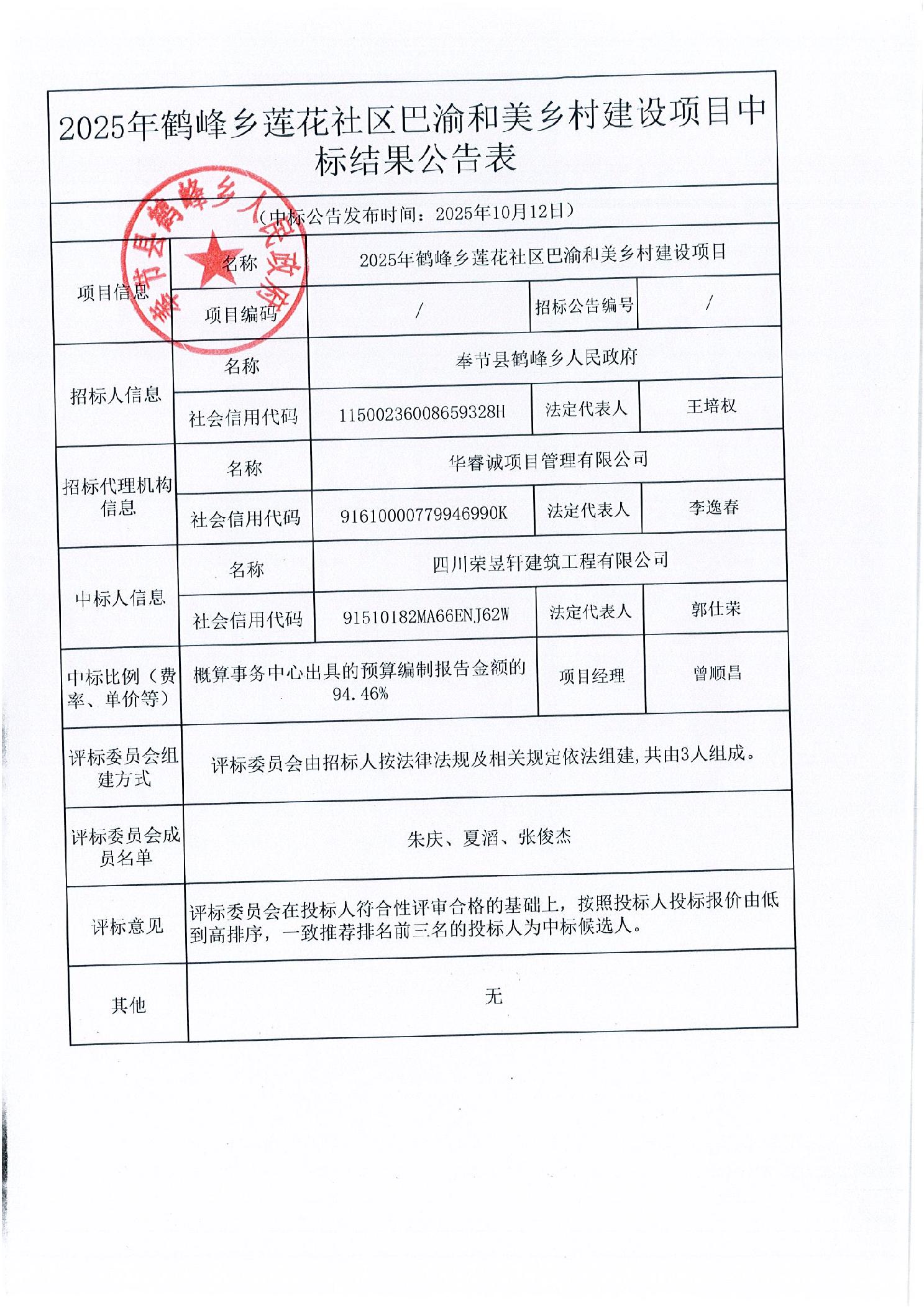 2025年鹤峰乡莲花社区巴渝和美乡村建设项目中标结果公告表